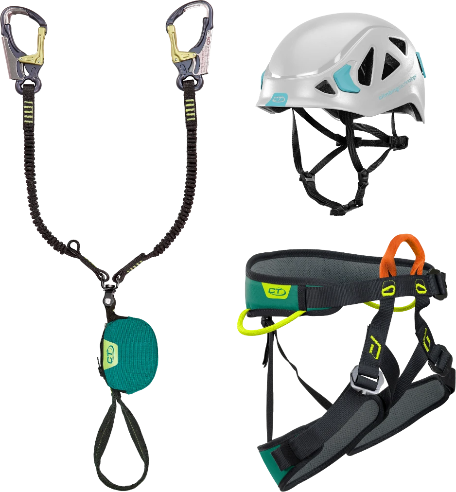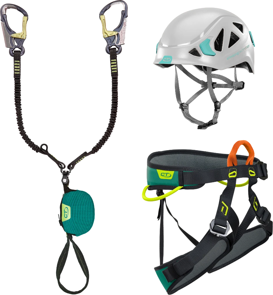 Climbing Technology Vf-Kit Top Shell: ferratový set který se skládá z via ferrata setu Top Shell Twist, sedacího úvazku Explorer a přilby. Model přilby závisí od velikosti hlavy ECLIPSE (S-M, 48-56 cm) nebo GALAXY (M-L, 54-62 cm).