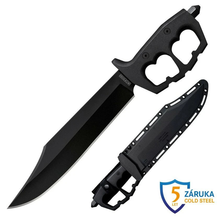 Cold Steel Chaos Bowie (SK-5) – je velký a robusní lovecký nůž tradičního Bowie tvaru doplněný o moderní prvky, které ho posouvají do kategorie nože zákopového nebo útočného. Má ochranu ruky z pevnostního hliníku 6061, kterou využijete jako boxer. Na konci je tlouk, který např. použijete na rozbití skla.