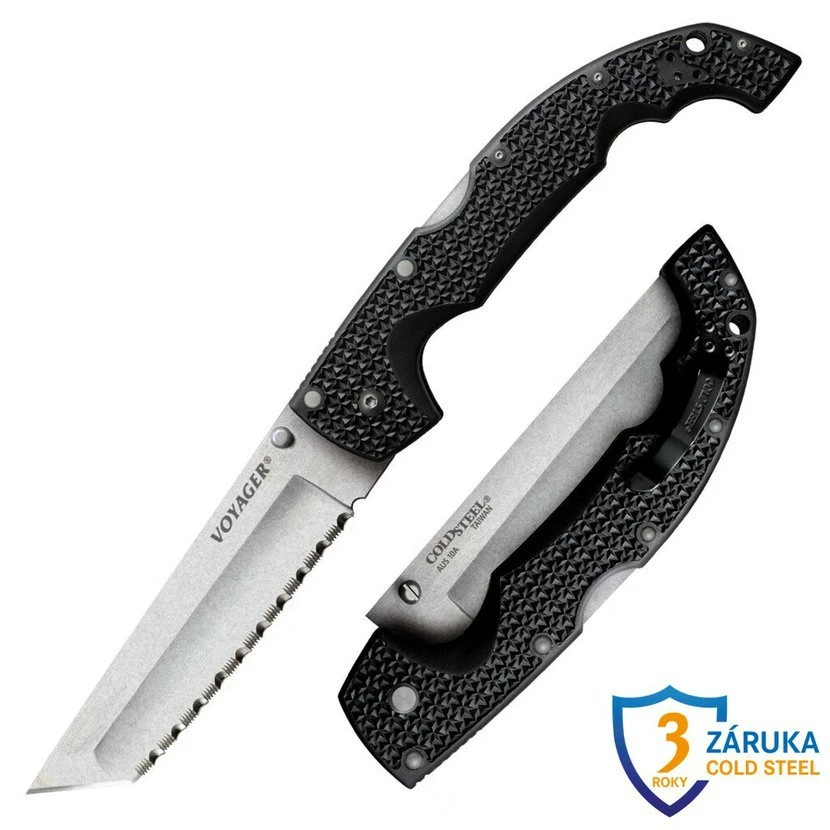 Cold Steel Extra Large Voyager Tanto Serrated – je atypický zavírací nůž s tanto čepelí s délkou 311 mm s velmi spolehlivou pojistkou. Rukojeť je velmi dobře tvarovaná, nesmeká se.