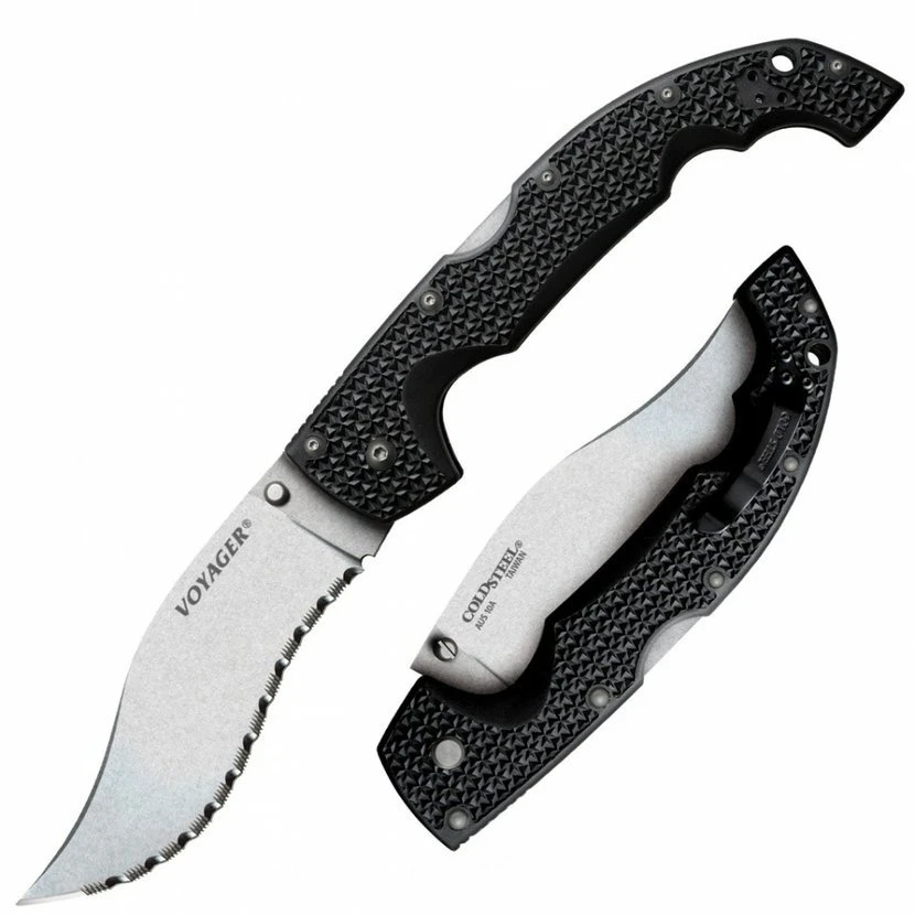 Cold Steel Extra Large Voyager Vaquero Serrated – je zavírací nůž netradičního designu se solidní délkou 304 mm s velmi spolehlivou pojistkou. Rukojeť je ergonomicky tvarovaná, nesmeká se. Tomu samozřejmě napomůže strukturovaný materiál Long Griv-Ex.