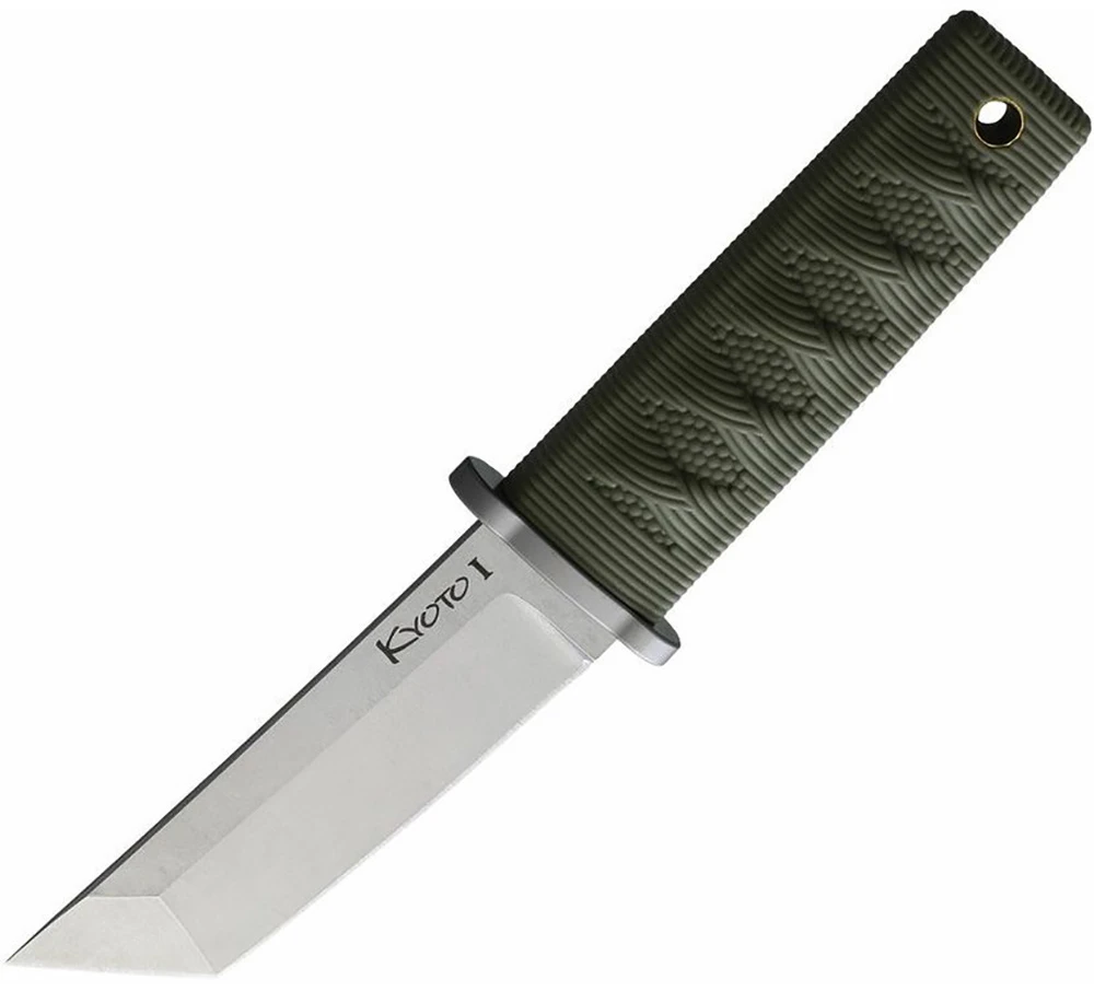Cold Steel Kyoto I OD – je menší nůž s hladkou a pevnou čepelí ve tvaru japonských mečů o délce 17,5 cm. Má hladké ostří. Full tang konstrukce zajišťuje odolnost a jistotu při jakékoliv práci, kde dochází k namáhání nože.
