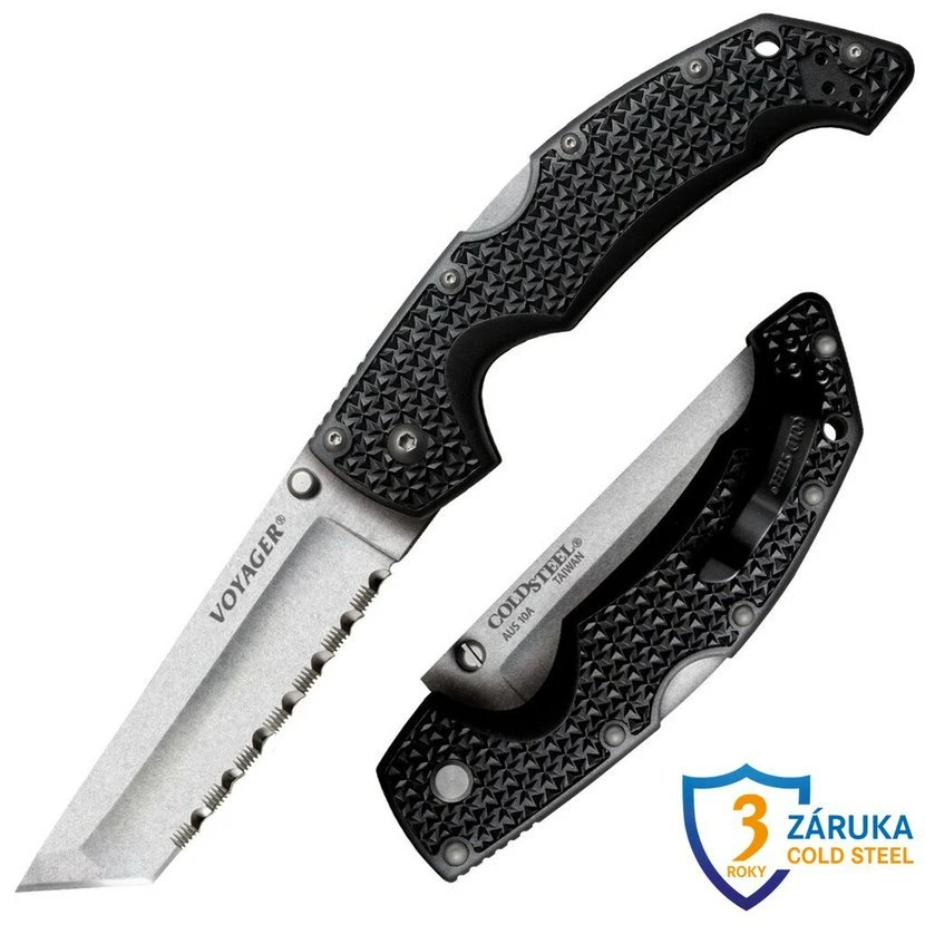 Cold Steel Large Voyager Tanto Pt. Serrated – je atypický zavírací nůž s délkou 234 mm s velmi spolehlivou pojistkou. Rukojeť je velmi dobře tvarovaná, nesmeká se.