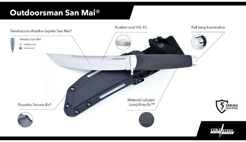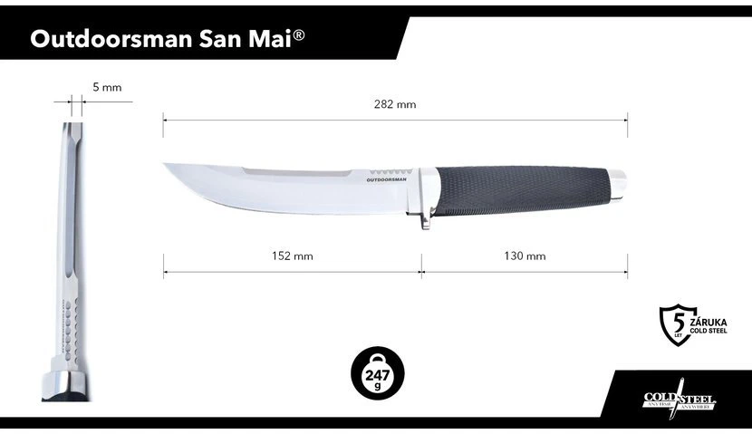Cold Steel Outdoorsman San Mai – je 28 cm dlouhý, velmi dobře materiálově zvolený lovecký nůž, který se hodí pro lov nebo bushcraft aktivity v přírodě. Má pevnou čepel s délkou 15 cm a šířkou 5 mm, tedy je velmi robusní a odolný. Ostří s širokým břichem výborně řeže. Hrot snadno proniká do materiálu.