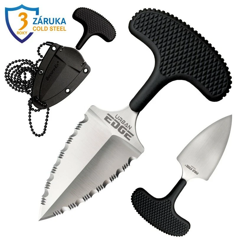 Cold Steel Urban Edge Serr. (AUS8A) – je určený pro EDC využití, kdy typicky ho můžete nosit na krku. Jedná se o tlačnou dýku, která je oboustranně broušena, má zubaté ostří na řezání nylonových lan a popruhů. Má pouzdro, které je připraveno pro zavěšení na krk.