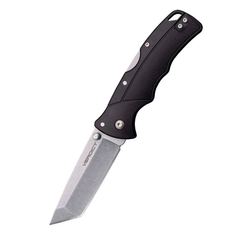 Cold Steel Verdict Tanto Point 4116 – je kapesní nůž s čepelí tanto point, která je inspirována japonskými meči. Výborně se hodí na sekání, ale v místě setkání primární a sekundární čepele je i velmi účinný v řezu. Je vhodný pro univerzální použití, tam kde potřebujete spolehlivý a odolný nástroj na řezání, krájení, ale zároveň i na obranu.