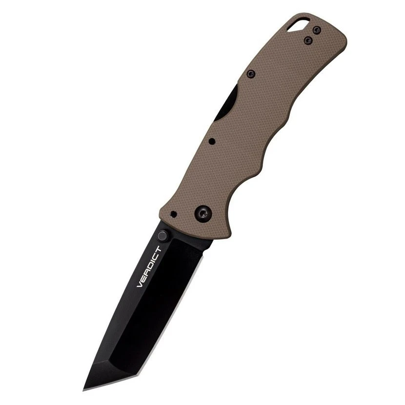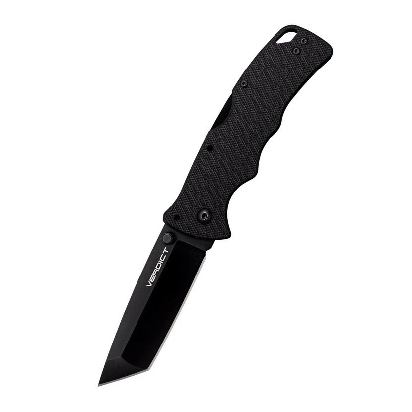 Cold Steel Verdict Tanto Point AUS10A – je kapesní nůž s čepelí tanto point, která je účinná pro řezání a sekání v místě střetu primární a sekundární čepele. Je vhodný pro univerzální použití, tam kde potřebujete spolehlivý a odolný nástroj na řezání, krájení, ale zároveň i na obranu.