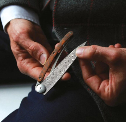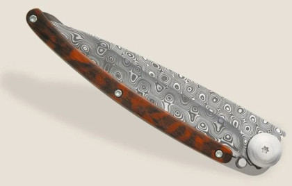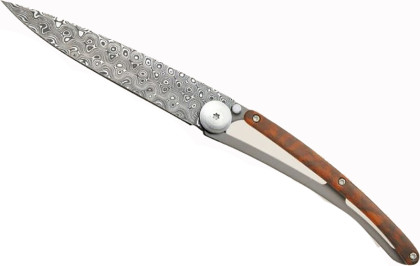 Deejo 1DB008 37g damascus snakewood: ultralehký kapesní nůž s damaškové oceli, která vyniká svou tvrdostí a odolností. Hmotnost nože je úžasných 37 g. Střenka je z tvrdého exotického dřeva snakewood. Toto dřevo vyniká svou hadí kresbou a patří mezi nejvzácnější a nejkrásnější dřeva.