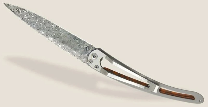 Deejo 1DB008 37g damascus snakewood: ultralehký kapesní nůž s damaškové oceli, která vyniká svou tvrdostí a odolností. Hmotnost nože je úžasných 37 g. Střenka je z tvrdého exotického dřeva snakewood. Toto dřevo vyniká svou hadí kresbou a patří mezi nejvzácnější a nejkrásnější dřeva.
