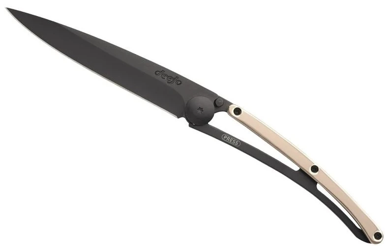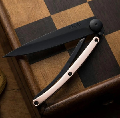 Deejo Gold Black 37g 18kt pink gold: limitovaná edice nože Deejo s rukojetí pokovenou 18-ti karátovým růžovým zlatem. Nůž je velmi lehký, váží pouhých 37 g, zaujme svým netradičním designem.