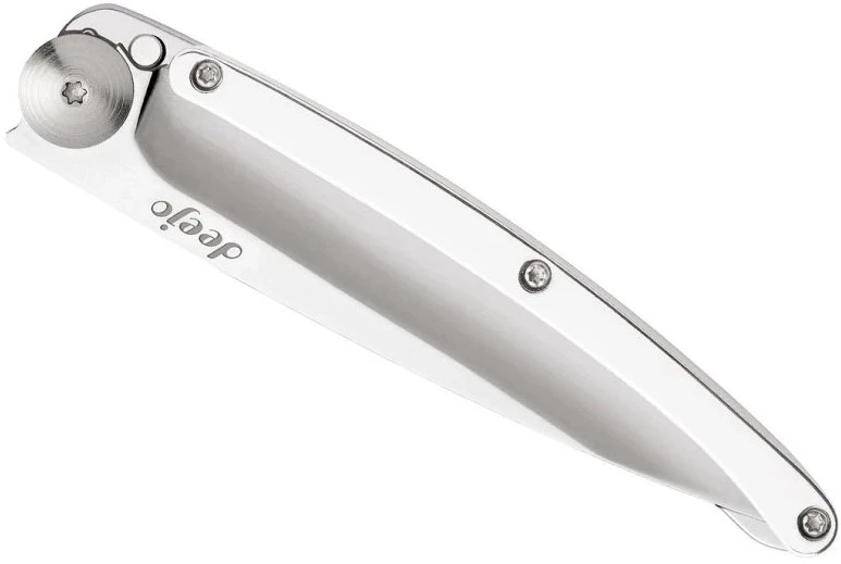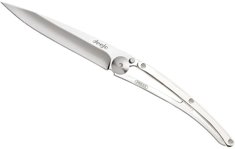 Deejo Gold Mirror 37g 9kt white gold: limitovaná edice nože Deejo s rukojetí pokovenou 9 kt bílým zlatem a čepelí v zrcadlovém lesku Nůž je velmi lehký, váží pouhých 37 g, zaujme svým netradičním designem.