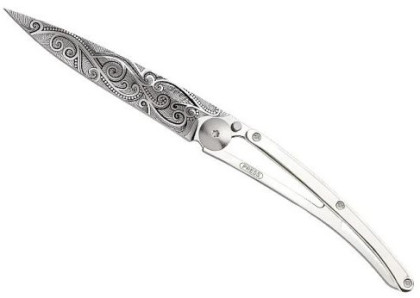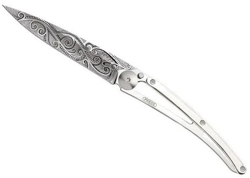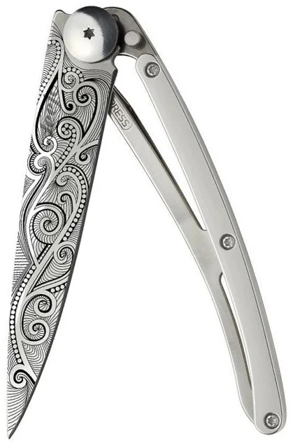 Deejo Gold Tattoo 27g 9kt white gold: elegantní kapesní nůž s rukojetí pokovenou 9 kt bílým zlatem. Nůž je velmi lehký, váží pouhých 27 g, zaujme svým netradičním designem a motivem na čepeli.
