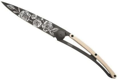 Deejo Gold Tattoo Black 27g 18kt pink gold: elegantní kapesní nůž s rukojetí pokovenou 18-ti karátovým růžovým zlatem. Nůž je velmi lehký, váží pouhých 27 g, zaujme svým netradičním designem a motivem na čepeli.