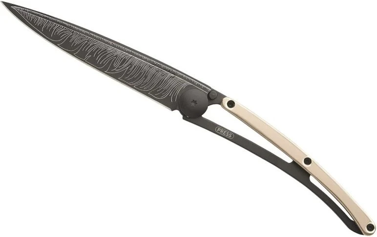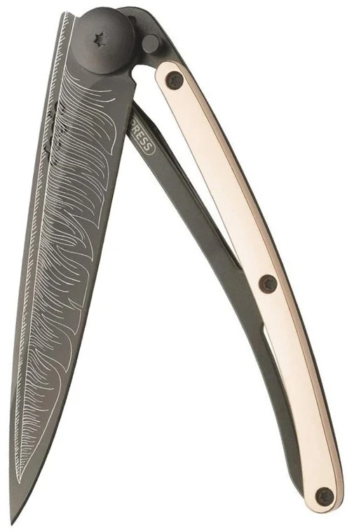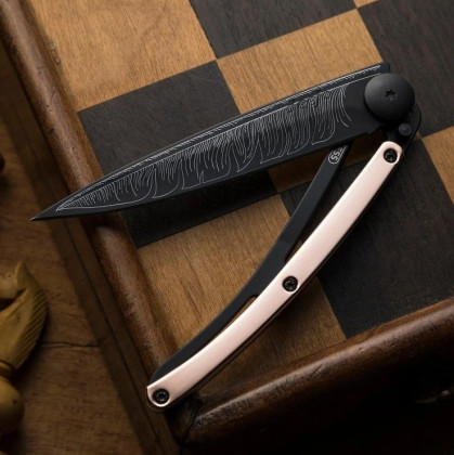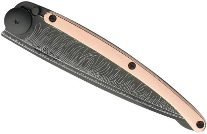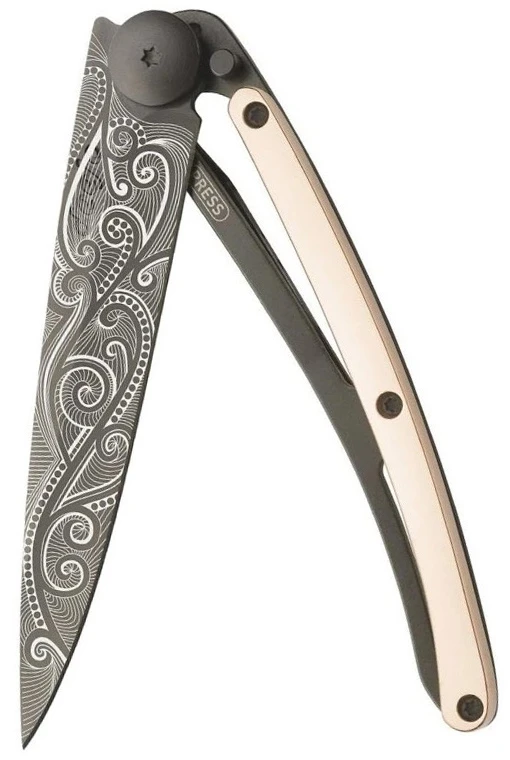 Deejo Gold Tattoo Black 37g 18kt pink gold: limitovaná edice nože Deejo s rukojetí pokovenou 18-ti karátovým růžovým zlatem. Nůž je velmi lehký, váží pouhých 37 g, zaujme svým netradičním designem a různými motivy na čepeli.