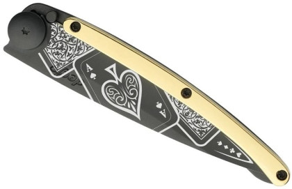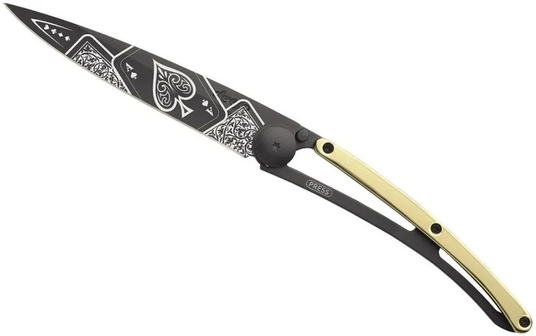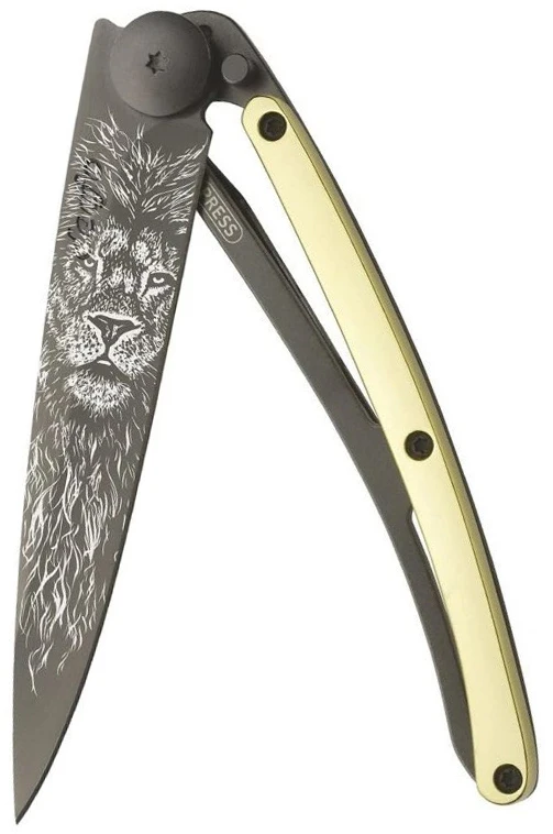 Deejo Gold Tattoo Black 37g 23kt yellow gold: limitovaná edice nože Deejo s rukojetí pokovenou pravým 23-karátovým zlatem. Nůž je velmi lehký, váží pouhých 37 g, zaujme svým netradičním designem a různými motivy na čepeli.