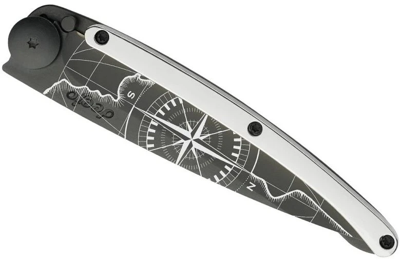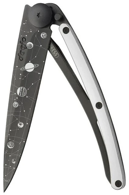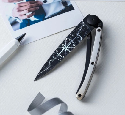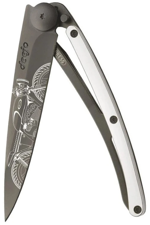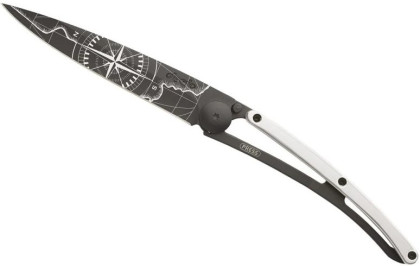 Deejo Gold Tattoo Black 37g 9kt white gold: limitovaná edice nože Deejo s rukojetí pokovenou 9 kt bílým zlatem. Nůž je velmi lehký, váží pouhých 37 g, zaujme svým netradičním designem a různými motivy na čepeli.