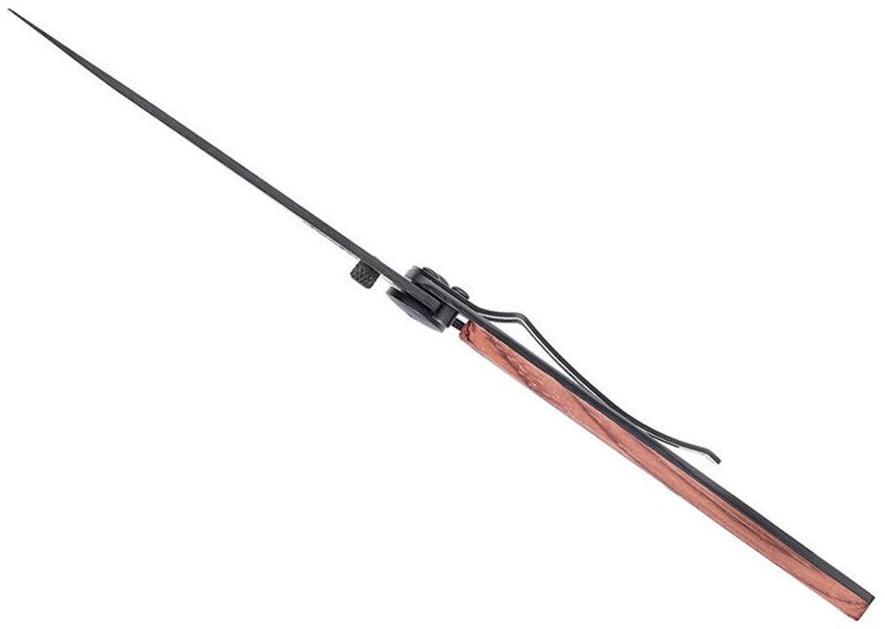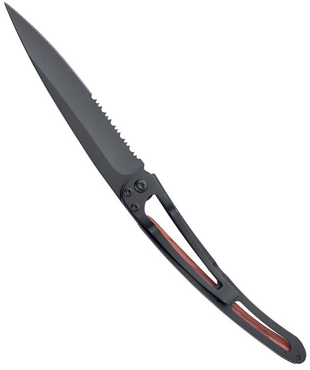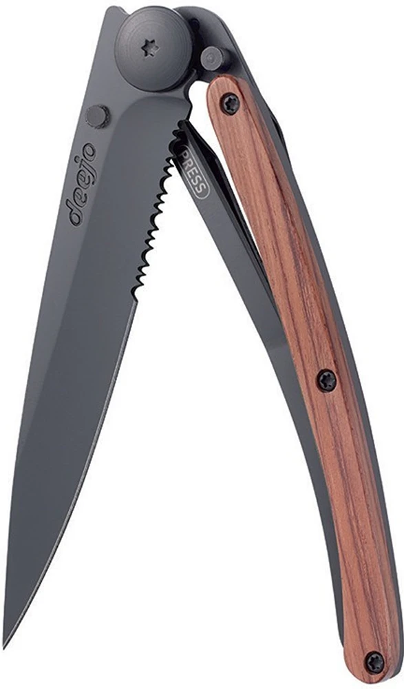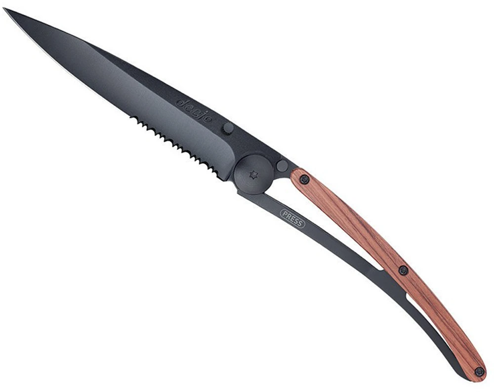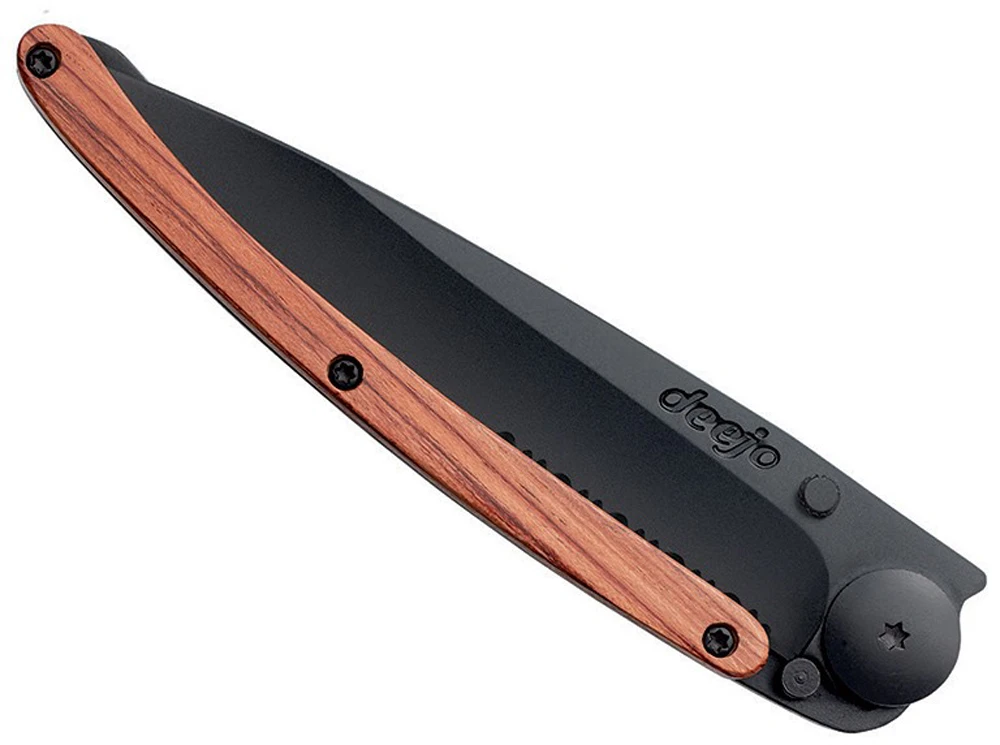 Deejo One Hand Black 37 g CoralWood – zavírací nůž se zubatým ostřím z kolekce One Hand - otevřete jednou rukou. Tento moderní nůž má velmi pěkný design, černou čepel a střenku z exotické dřeviny Coralwood. V otevřeném stavu má rozměr přes 20 cm a váží pouhých 37g. Nůž je vyroben z nerezové oceli, oceníte i klip na zavěšení.