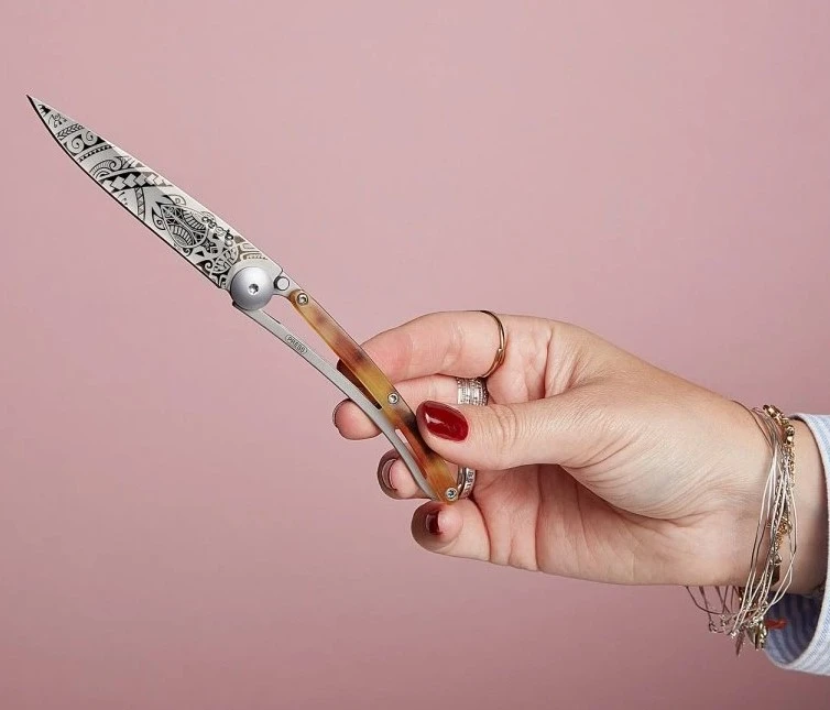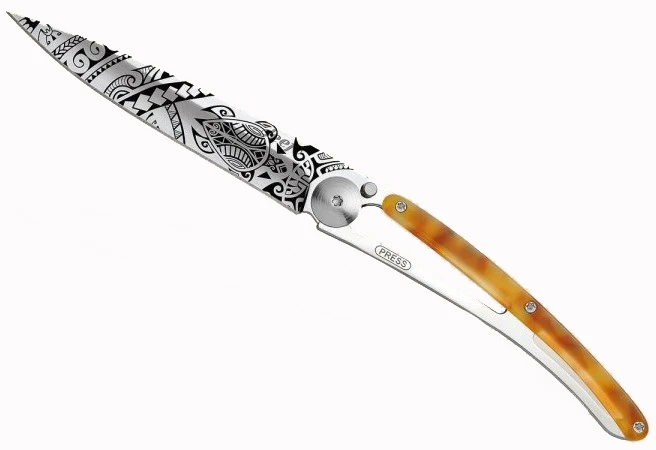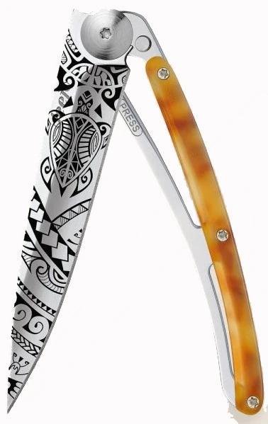 Deejo Tattoo 27g light turtle: ultralehký kapesní nůž s čepelí s vysokým leskem. Hmotnost nože je úžasných 27 g. Rukojeť ze syntetické želvoviny pasuje nůž na elegantní doplněk.