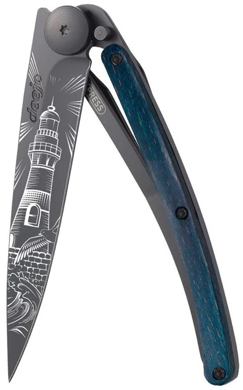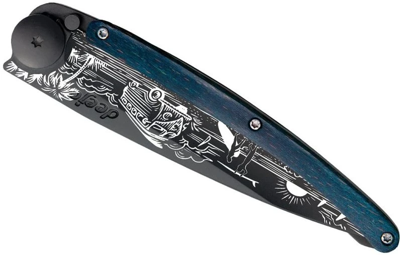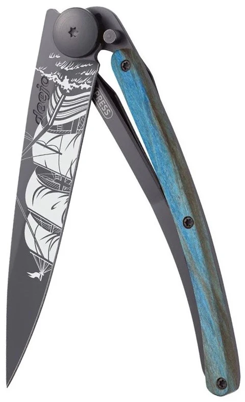 Deejo Tattoo 37g blue beech: stylový ultralehký nůž s netradičním designem a mořskými motivy. Váží pouhých 37 g. Hladká čepel, rukojeť z tvrdého bukového dřeva je mořená do barevných odstínů.
