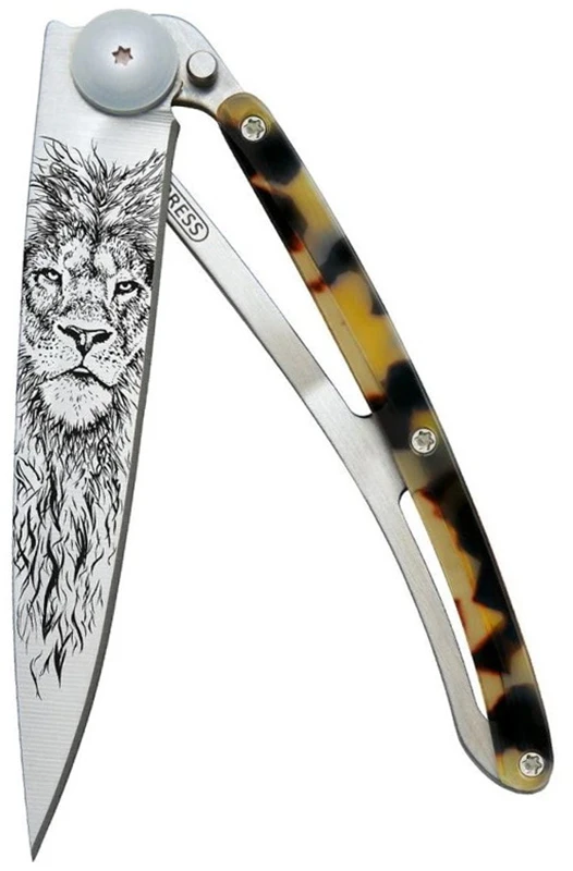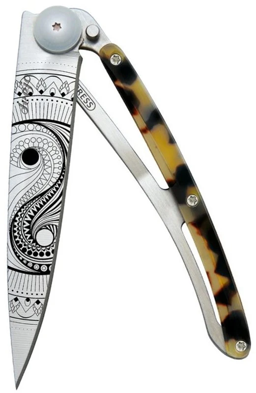 Deejo Tattoo 37g dark turtle: ultralehký kapesní nůž se světle šedou matnou čepelí a tetováním s různými motivy. Hmotnost nože je úžasných 37 g. Rukojeť ze syntetické želvoviny pasuje nůž na elegantní doplněk.