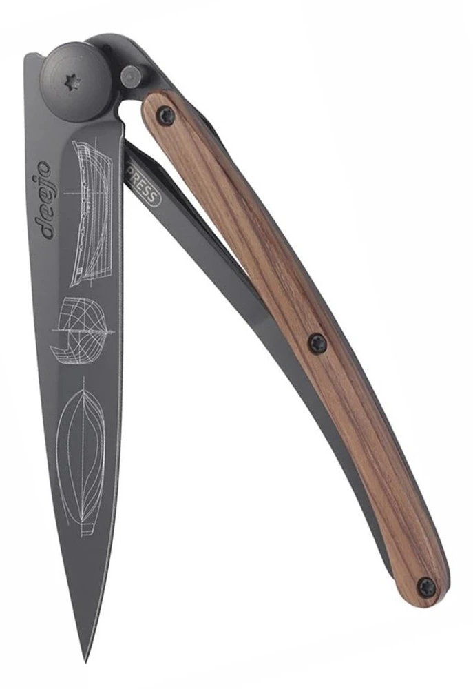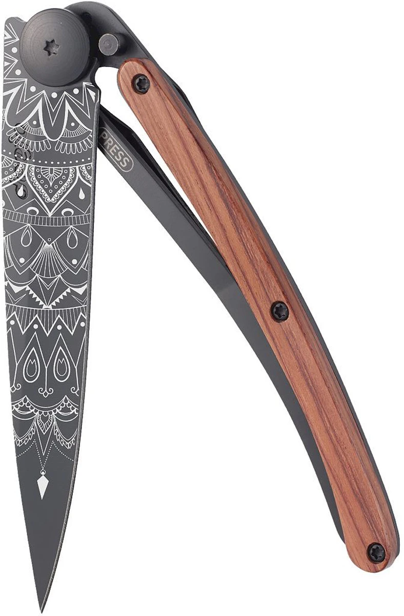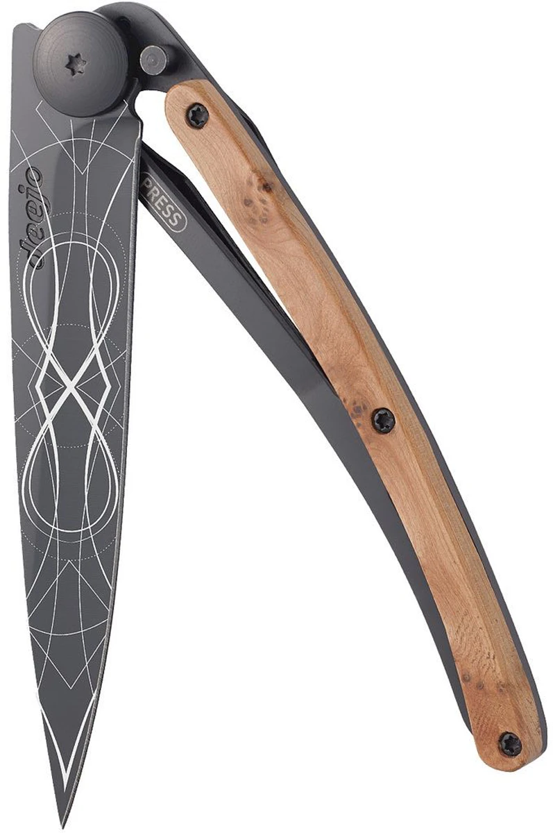 Deejo Tattoo Black 37 g – s povrchovou úpravou čepele do černa a různými motivy. Hmotnost je úžasných 37 g. Dřevěné střenky. Samozřejmostí je i pojistka proti zavření i u tak minimalistického nože jako je Deejo Tattoo.
