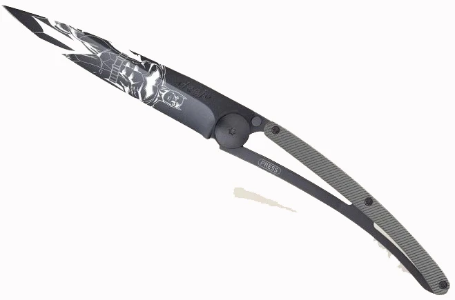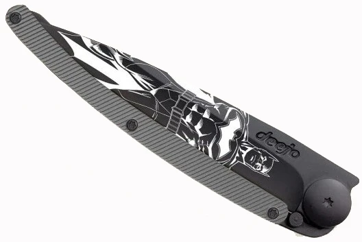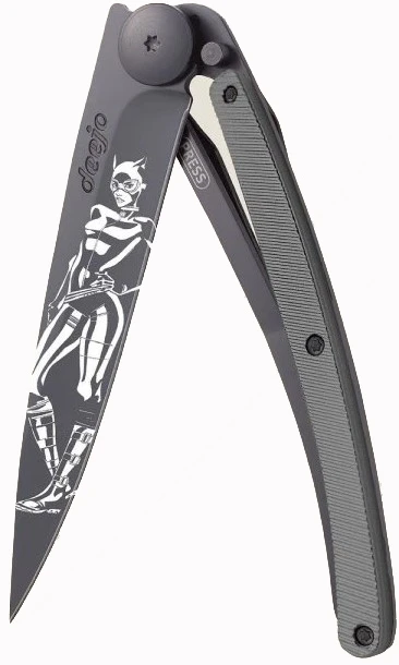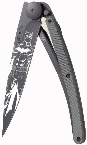 Deejo Tattoo Black 37g aluminium DC Comics: stylový ultralehký nůž z kolekce DC Comics s hliníkovou střenkou s hydrografickým potiskem a odolnou černou čepelí s tetováním.
