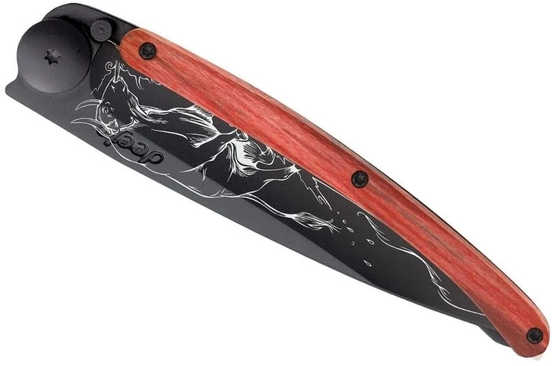 Deejo Tattoo 37g blue beech: stylový ultralehký nůž s netradičním designem. Váží pouhých 37 g. Hladká čepel, rukojeť z tvrdého bukového dřeva je mořená do barevných odstínů.