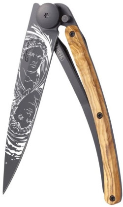 Deejo Tattoo Black 37g olive wood: tylový ultralehký nůž Deejo z kolekce Zodiac se střenkou z olivového dřeva a motivem znamení zvěrokruhu. Je to designově velmi zajímavý kousek se spolehlivou pojistkou typu liner lock a sponou na pásek.