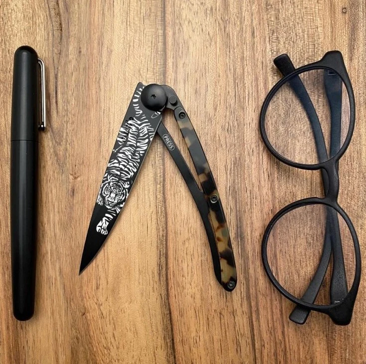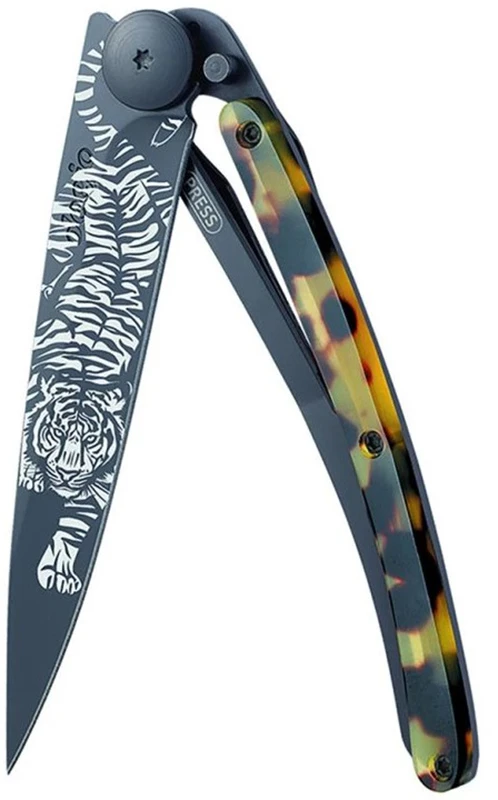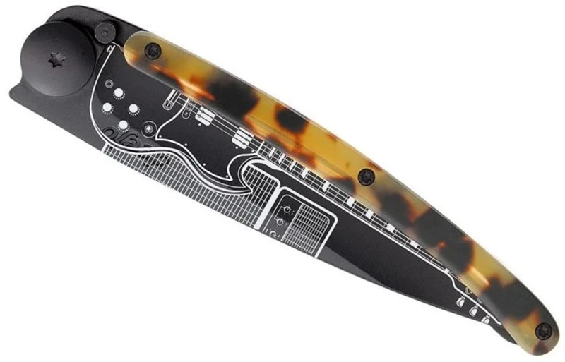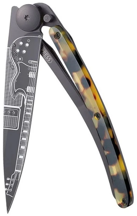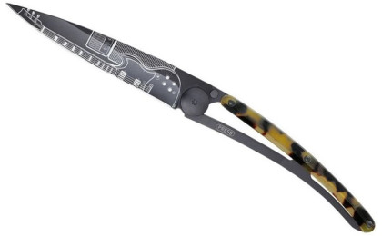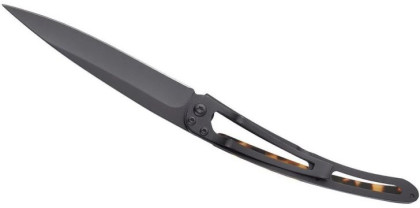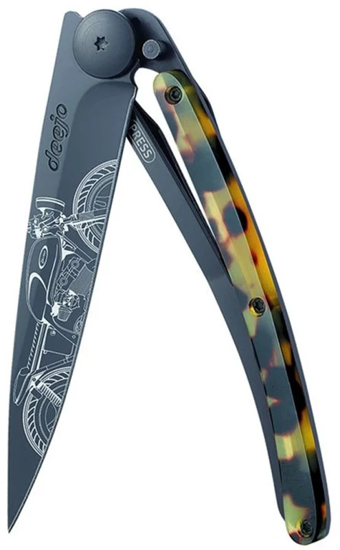Deejo Tattoo Black 37g turtle shell: ultralehký kapesní nůž s tmavou čepelí s různým tetováním. Hmotnost nože je úžasných 37 g. Rukojeť ze syntetické želvoviny pasuje nůž na elegantní doplněk.
