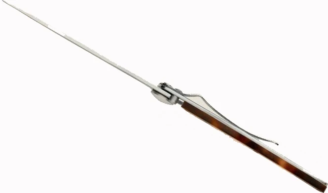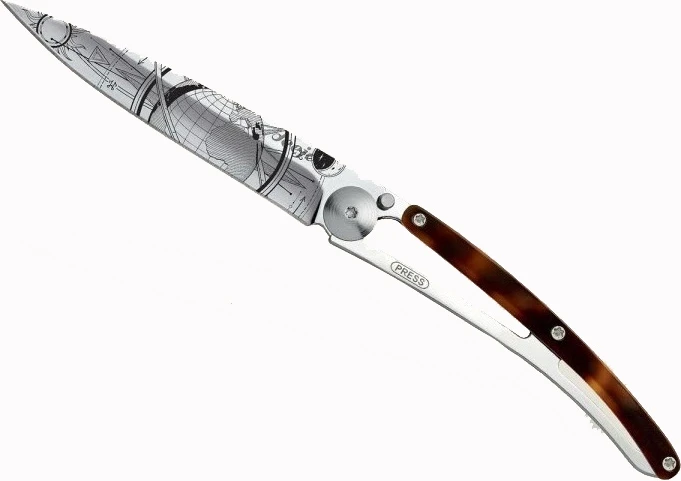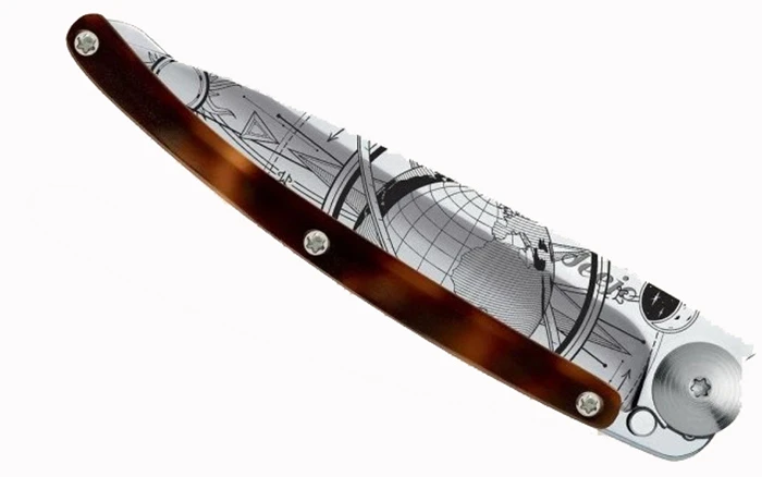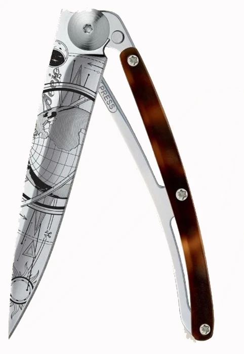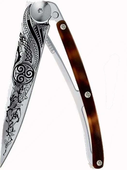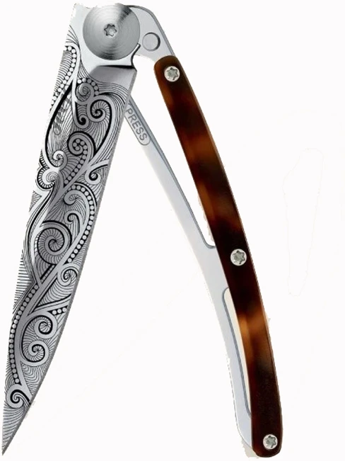 Deejo Tattoo Mirror 37g ambered turtle: ultralehký kapesní nůž s čepelí s vysokým leskem a tetováním s různými motivy. Hmotnost nože je úžasných 37 g. Rukojeť ze syntetické želvoviny pasuje nůž na elegantní doplněk.