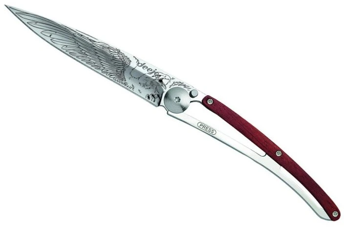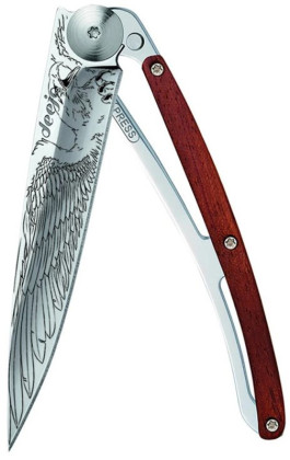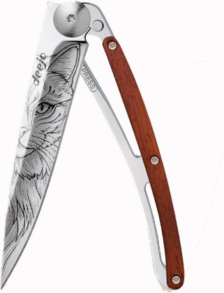 Deejo Tattoo Mirror 37g coralwood: ultralehký kapesní nůž s čepelí s vysokým leskem a tetováním s různými motivy. Hmotnost nože je úžasných 37 g. Rukojeť z exotického dřeva coralwood vyniká svým elegantním načervenalým odstínem.