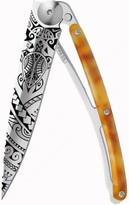 Deejo Tattoo Mirror 37g turtle shell: ultralehký kapesní nůž s čepelí s vysokým leskem a tetováním s různými motivy. Hmotnost nože je úžasných 37 g. Rukojeť ze syntetické želvoviny pasuje nůž na elegantní doplněk.
