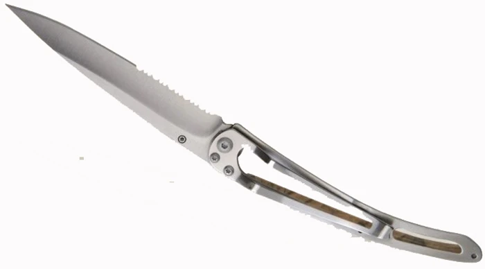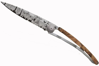 Deejo Tattoo Serration 37g brown camo: stylový ultralehký nůž s netradičním designem. Váží pouhých 37 g. Nůž má čepel s částečně zubatým ostřím a hliníkovou rukojeť s potiskem camo, která vyniká svou odolností.