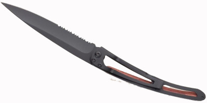 Deejo Tattoo Serration Black 37g coralwood: stylový ultralehký nůž s netradičním designem. Váží pouhých 37 g. Nůž má čepel s částečně zubatým ostřím a rukojeť z exotického dřeva coralwood které vyniká svým elegantním načervenalým odstínem