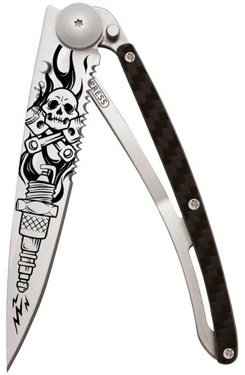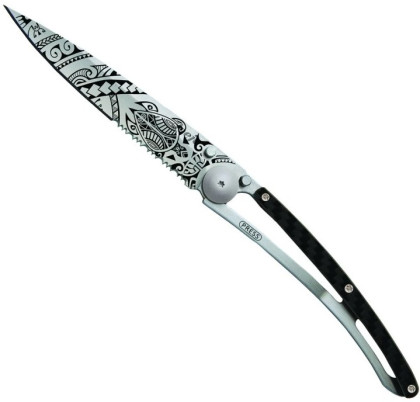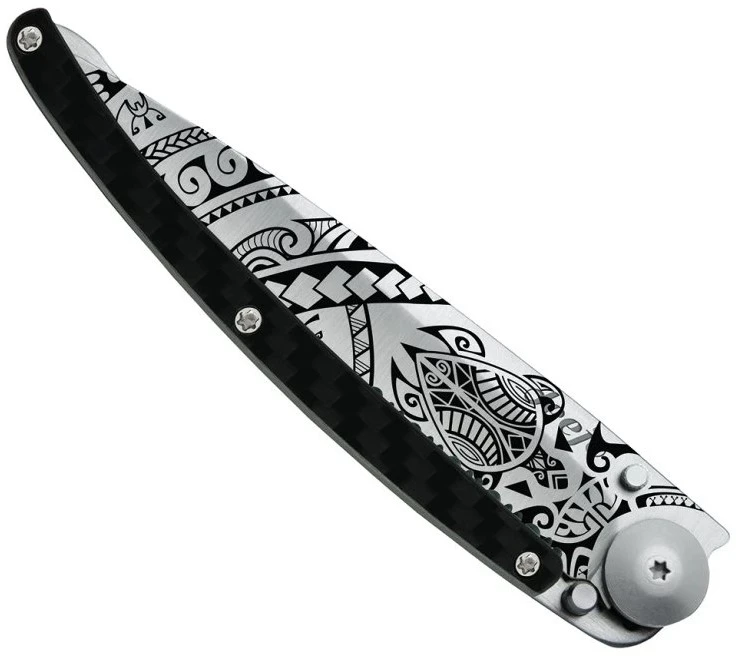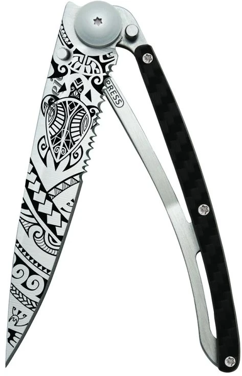 Deejo Tattoo Serration 37g carbon fiber: stylový ultralehký nůž s netradičním designem. Váží pouhých 37 g. Nůž má čepel s částečně zubatým ostřím a rukojeť z karbonu který vyniká svou odolností.