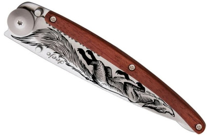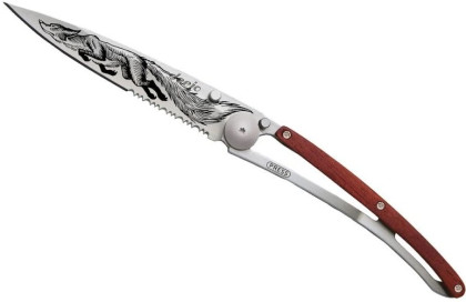 Deejo Tattoo Serration 37g coralwood Fox: stylový ultralehký nůž s netradičním designem. Váží pouhých 37 g. Nůž má čepel s částečně zubatým ostřím a motivem lišky. Rukojeť z exotického dřeva coralwood vyniká svým elegantním načervenalým odstínem.