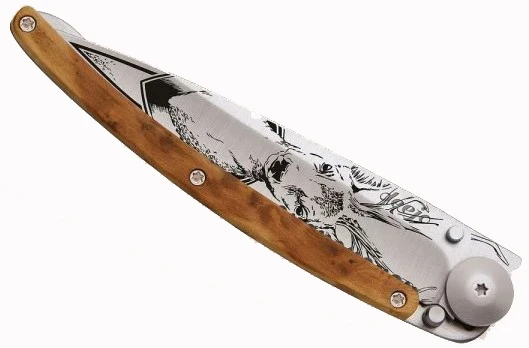 Deejo Tattoo Serration 37g juniper wood: stylový ultralehký nůž s netradičním designem. Váží pouhých 37 g. Nůž má čepel s částečně zubatým ostřím a rukojeť z kořene exotického jalovce který vyniká svou trvalou a pronikavou pepřovou vůní. Je odolné, lehké a pevné.