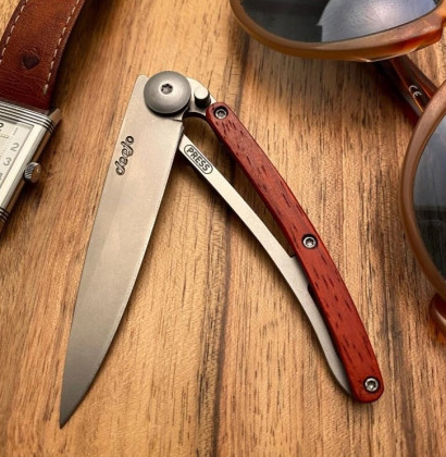 Deejo Wood Natural 27g coralwood: jednoduchý ultralehký kapesní nůž o hmotnosti pouhých 27 gramů. Rukojeť z exotického dřeva coralwood vyniká svým elegantním načervenalým odstínem.