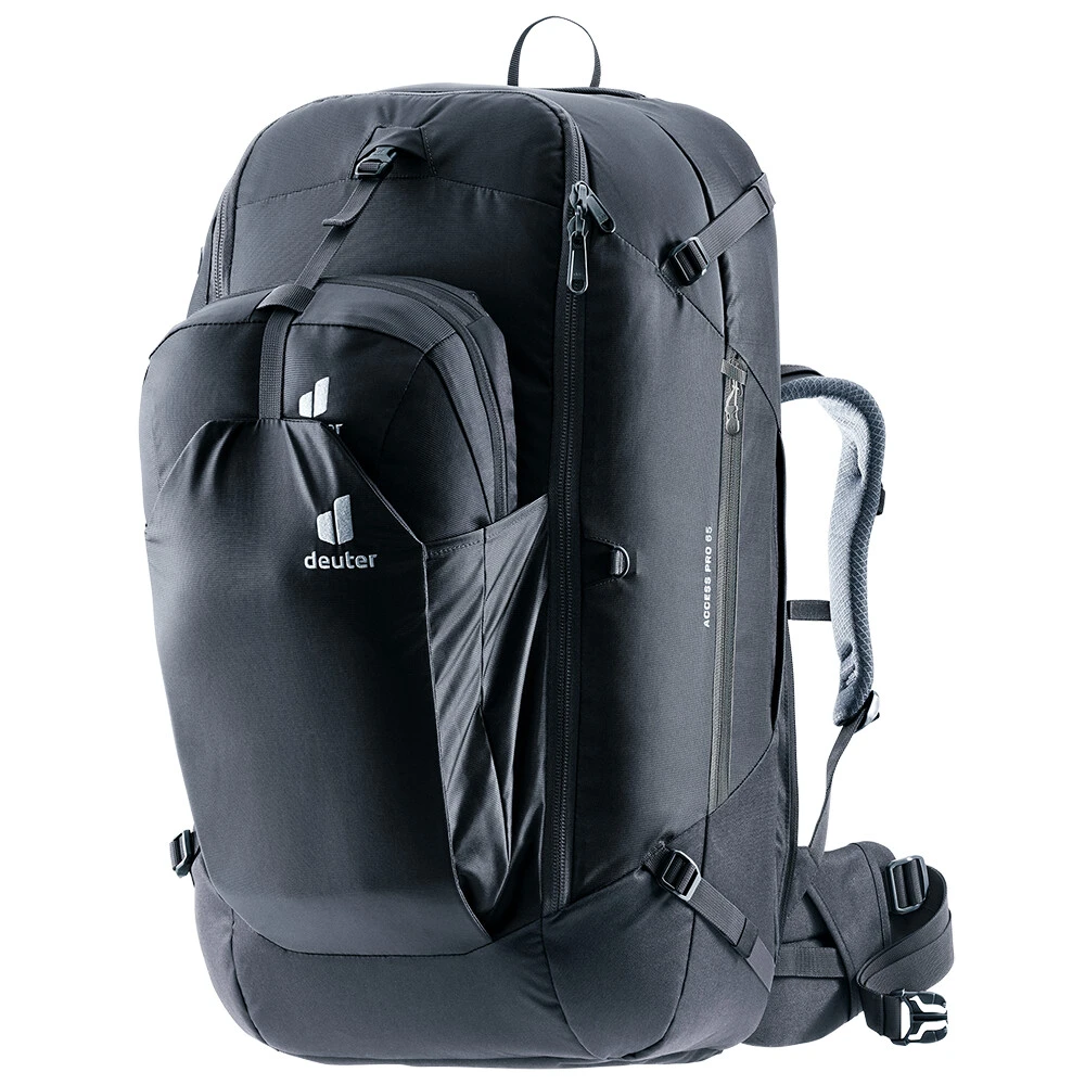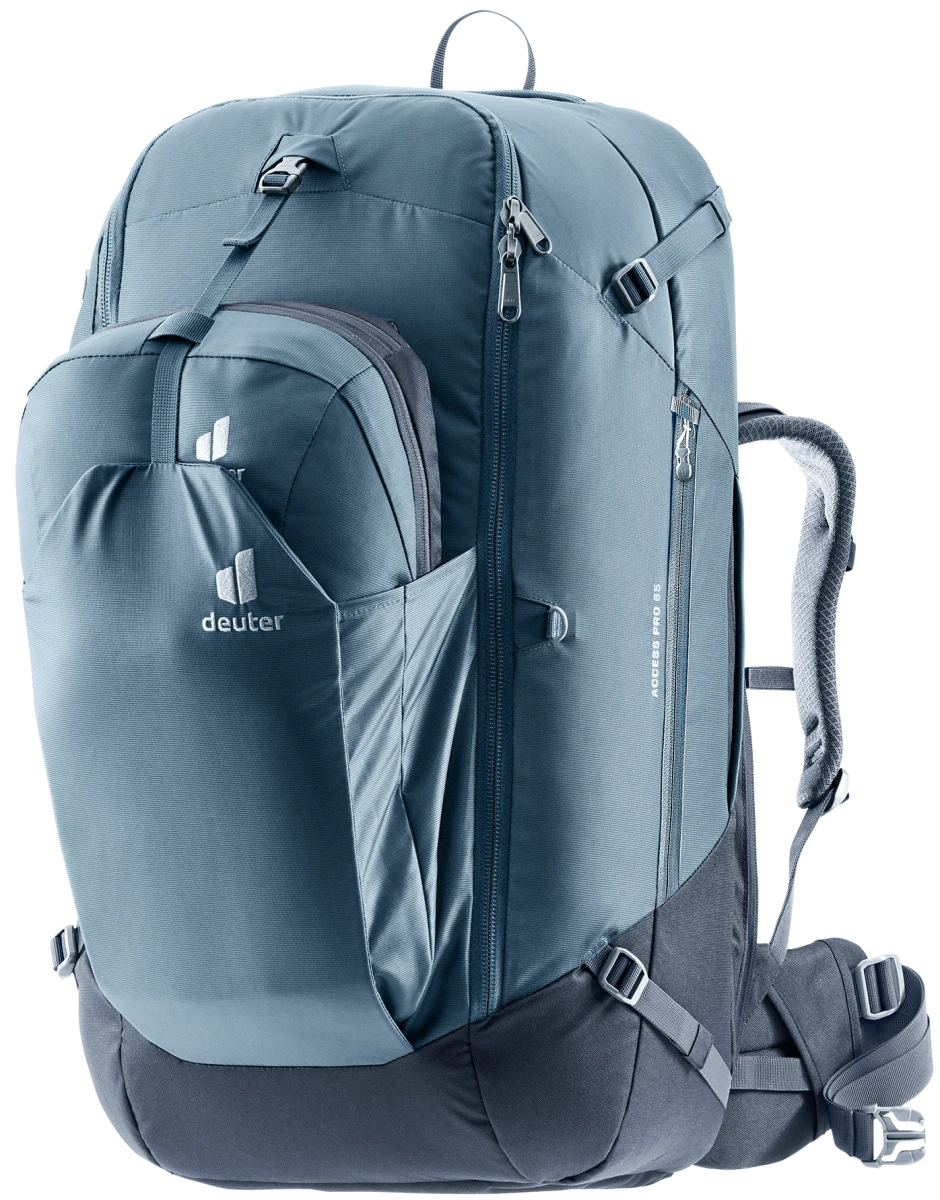 Deuter Access Pro 65: Maximální prostor pro světoběžníky. Potřebujete na své cesty ještě o kousek více místa, ale odmítáte s sebou vláčet neforemný kufr? Deuter Access Pro 65 je vlajkovou lodí řady Access. Kombinuje obří objem expedičního batohu s elegancí a organizací cestovního zavazadla.