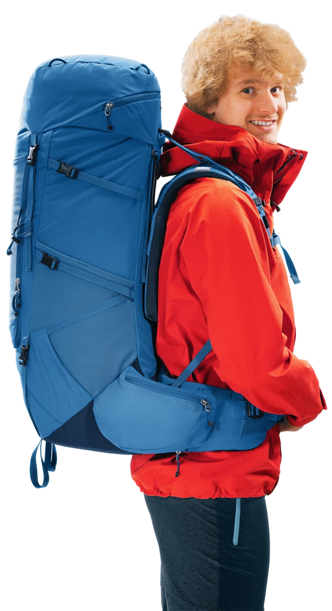 Batoh má kvalitní nastavitelný zádový systém Aircontact se síťovinou Air Spacer a ventilačním kanálem, což zajistí pohodlné nošení i v teplejším počasí. Ramenní popruhy ActiveFit jsou anatomicky tvarované s nastavitelným hrudním popruhem. Bederní pás je polstrovaný a anatomicky tvarovaný pro efektivní rozložení zátěže. Navíc má dvě odnímatelné kapsy o objemu 3 l na zip a v pravé kapse je ještě pouzdro na lahev o objemu 1,5 l.