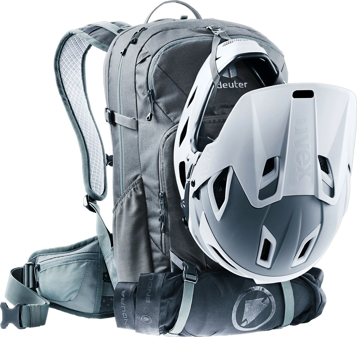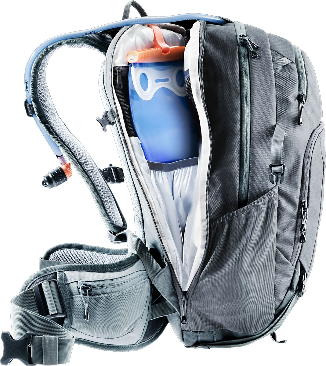 Na batohu najdete poutka pro upevnění helmy a chráničů, pláštěnku, která vaše věci udrží v suchu i v nepříznivém počasí. Dále najdete praktický organizér v přední kapse, kapsu na brýle, dvě boční elastické kapsy a dvě kapsičky na drobnosti na bederním pásu. Vnitřek batohu je také kompatibilní s hydrovakem do 3 l.