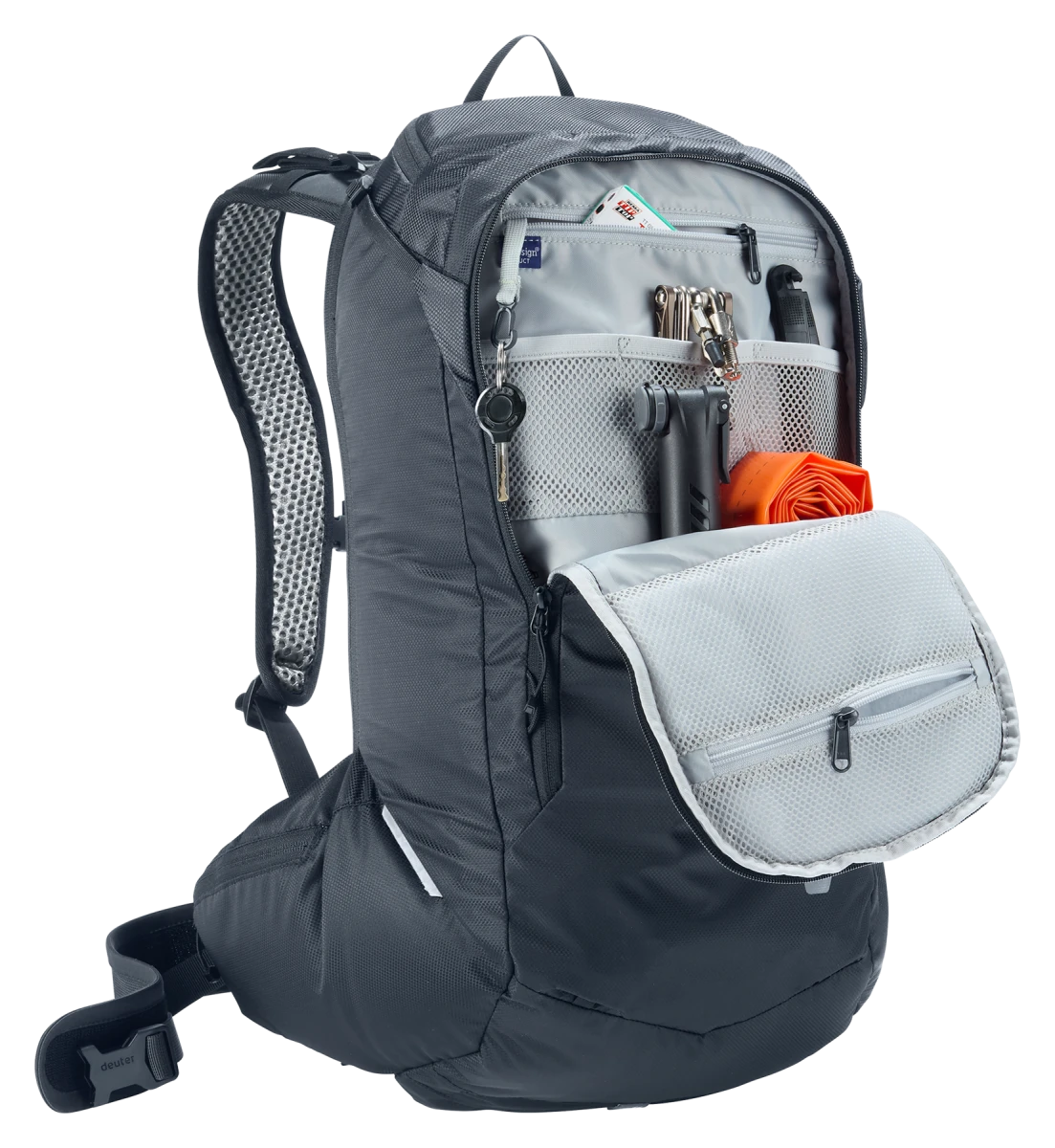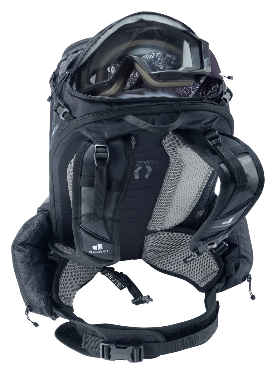 Na batohu najdete poutka pro upevnění helmy a chráničů, pláštěnku, která vaše věci udrží v suchu i v nepříznivém počasí. Dále najdete praktický organizér v přední kapse, kapsu na brýle, dvě boční elastické kapsy a dvě kapsičky na drobnosti na bederním pásu. Vnitřek batohu je také kompatibilní s hydrovakem do 3 l.