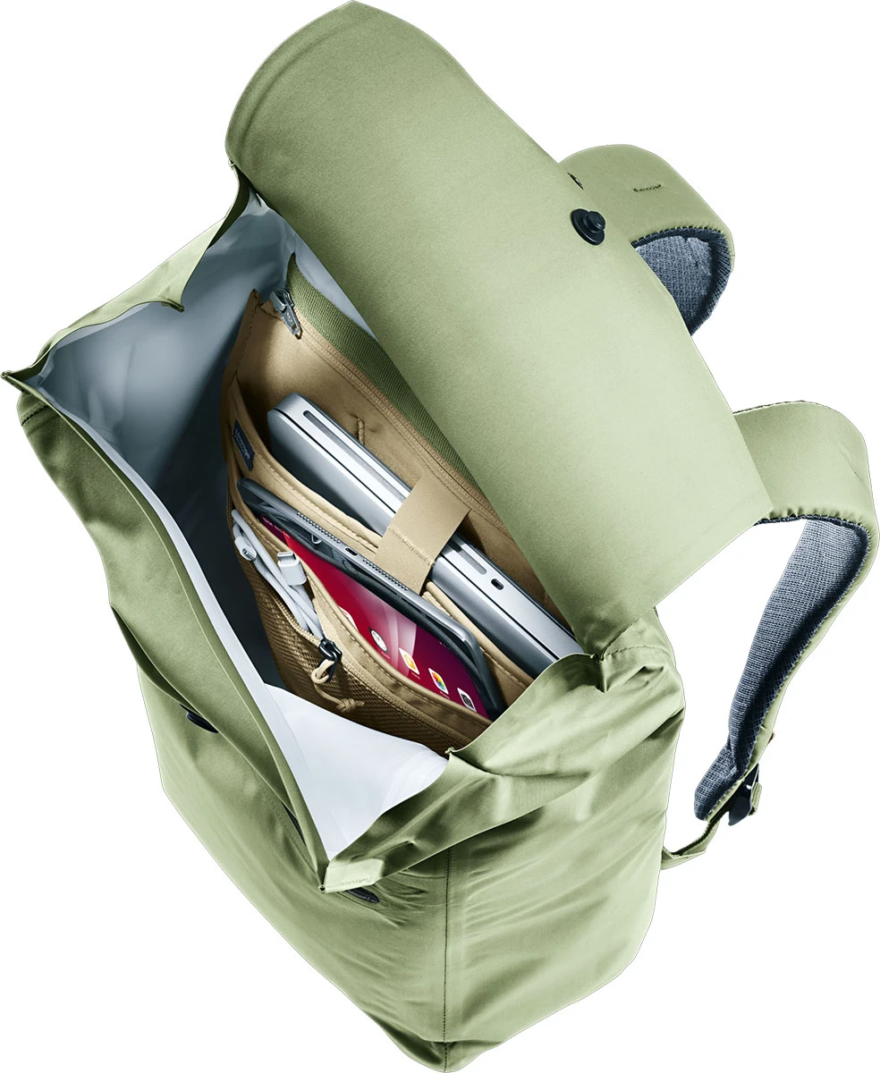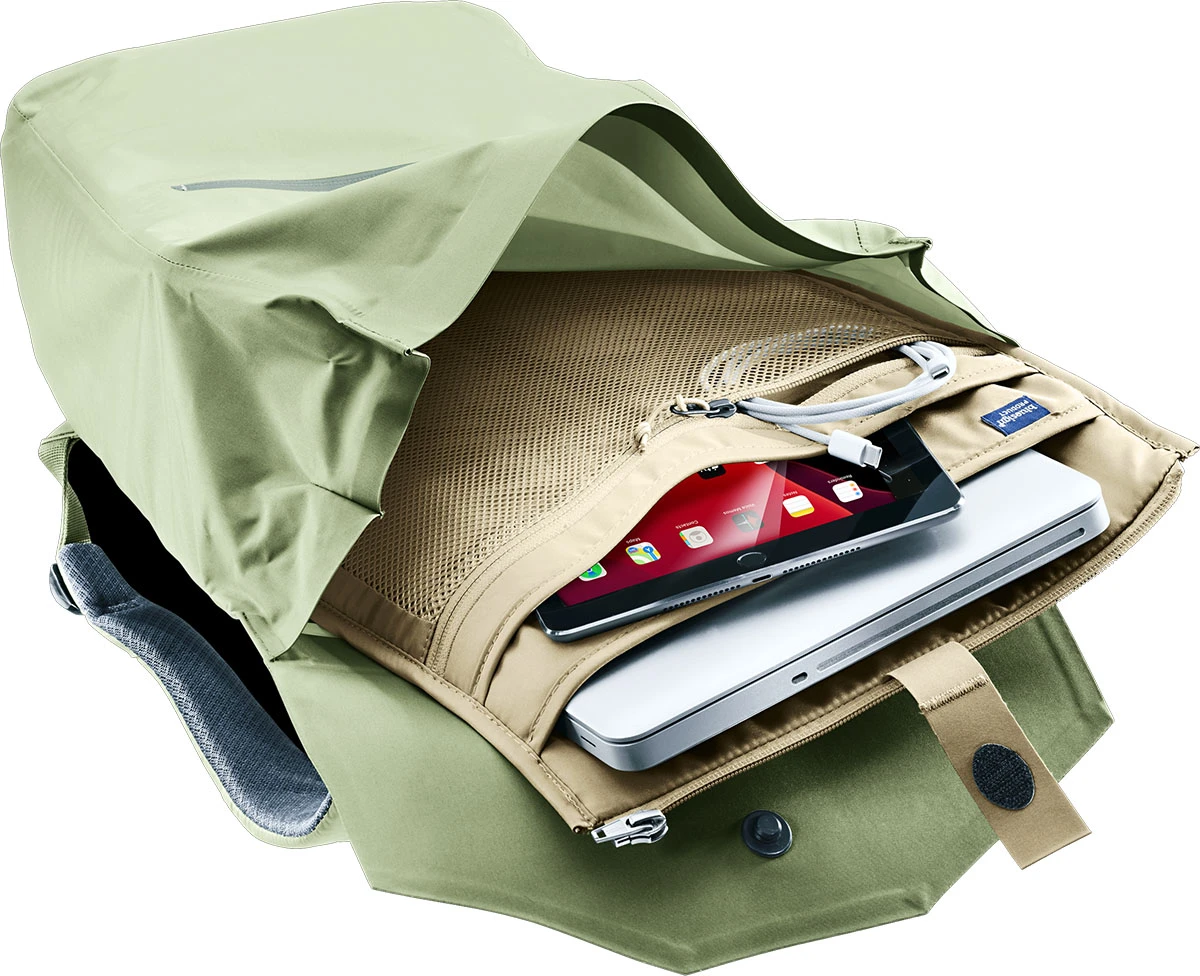 Deuter Drout 20: voděodolný batoh do města, do školy či do práce. Je vyroben z odolného materiálu s podlepenými a svařenými vodotěsnými švy a zipy potaženými TPU, aby byl obsah chráněn před deštěm a stříkající vodou.