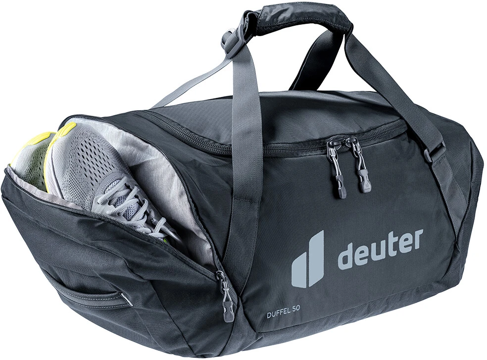 Deuter Duffel 50: praktická cestovní taška o objemu 50 litrů, je vyrobená ze 100% recyklovaných materiálů. Díky polstrovaným, nastavitelným popruhům lze nosit i jako batoh. Taška má kapsu na boty, uzamykatelné zipy. Součástí je vlastní úložný vak, který lze použít i jako organizér na věci.