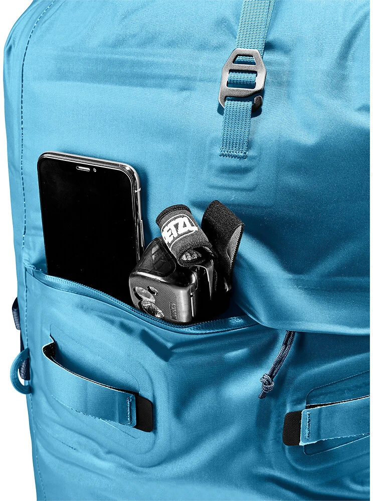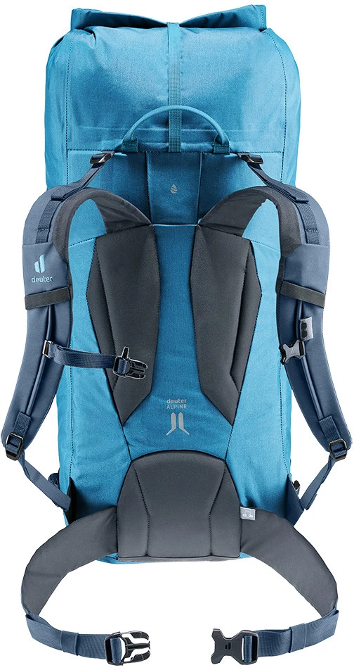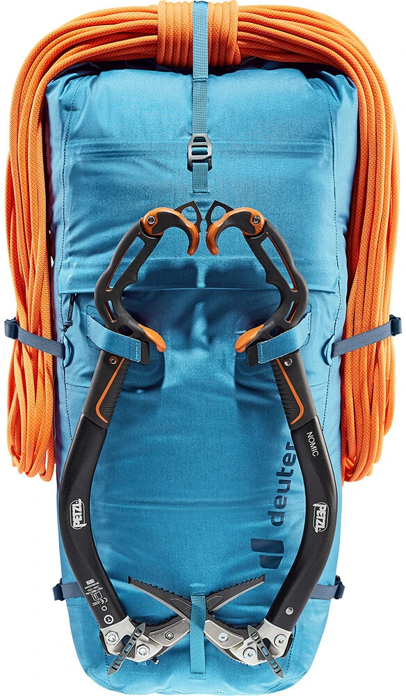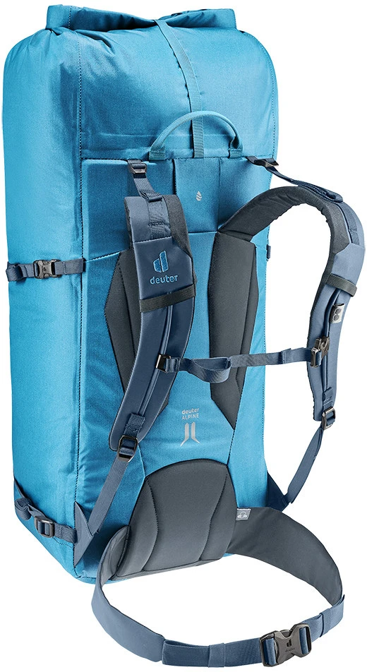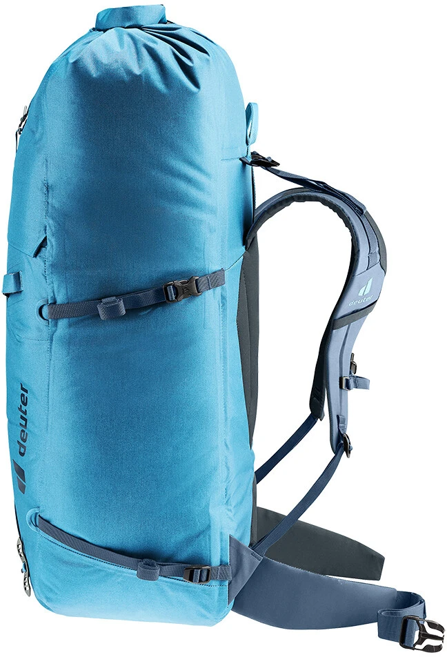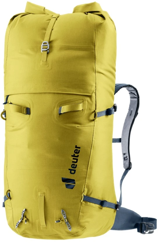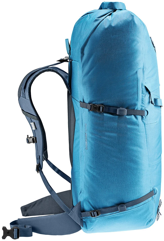 Deuter Durascent 44+10: lezecký voděodolný batoh, má objem 42 litrů a díky rolovacímu systému se dá zvětšit o dalších 10 litrů. Do batohu se tak vejde vybavení a další věci co budete potřebovat. Další vybavení jako lano, helmu, cepíny či trekové hole můžete připevnit na batoh díky poutkům.