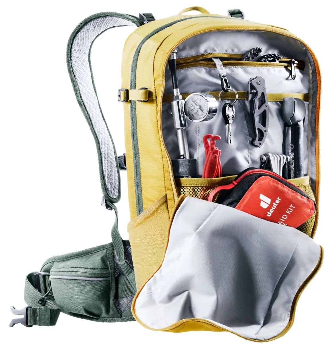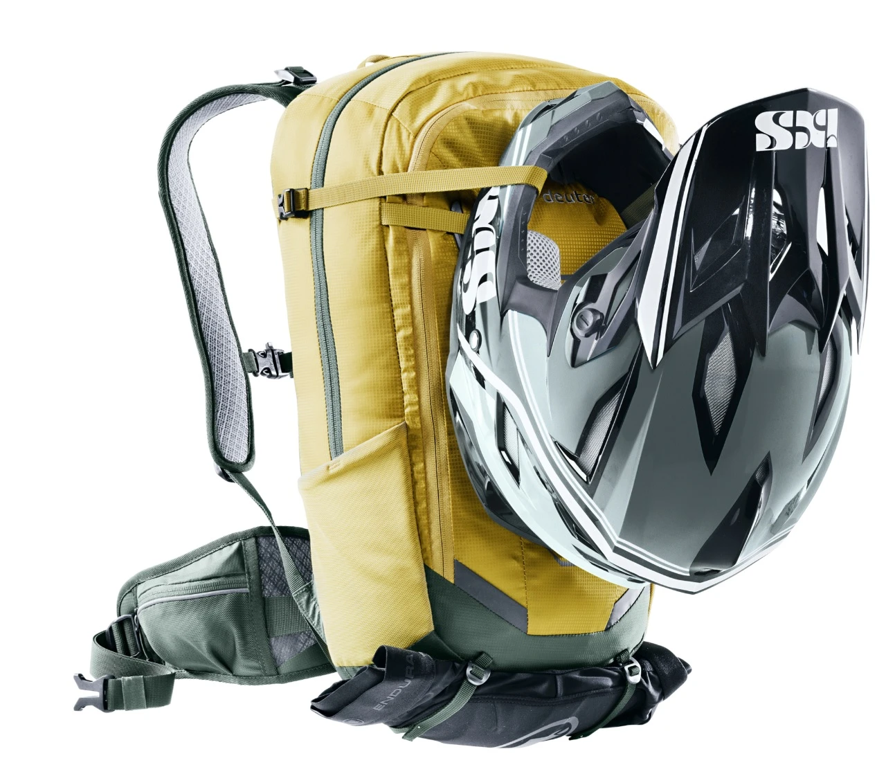 Tento cyklistický batoh má celkový objem 14 litrů. V prostorné hlavní kapse najdete dostatek místa na uložení náhradního oblečení, nebo hydrovaku na vodu, díky kterému budete dodržovat pitný režim. Přední menší kapsa disponuje praktickými kapsičkami, poutky a přihrádkami na uložení drobných předmětů a potřebného nářadí na kolo. Pomocí stahovacích popruhů, můžete k batohu jednoduše přidělat jak klasickou cyklistickou helmu, tak i objemnější celoobličejovou helmu s integrovanou ochranou brady. Další praktickou pomůckou je boční kapsa na mobilní telefon, nebo malá kapsa na zip, uložená na bederním páse batohu.