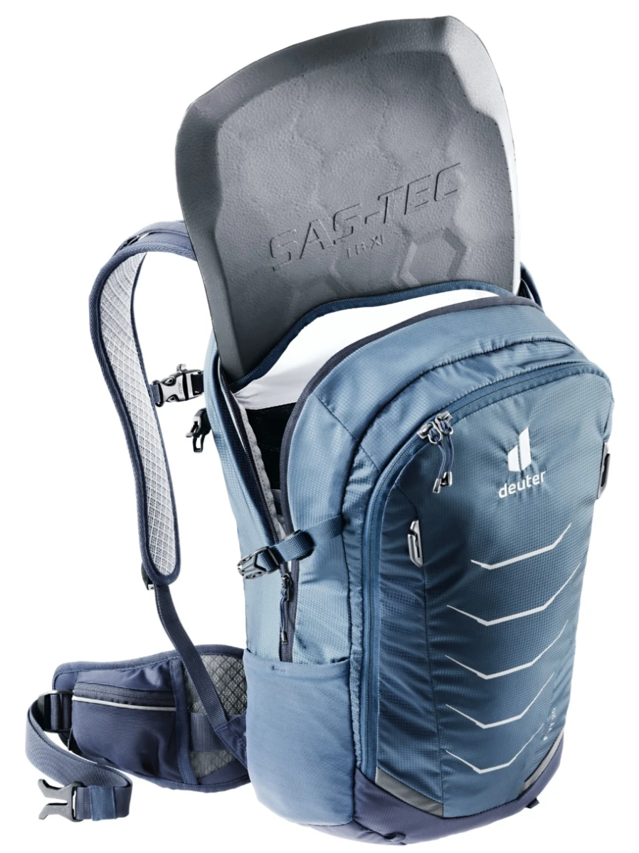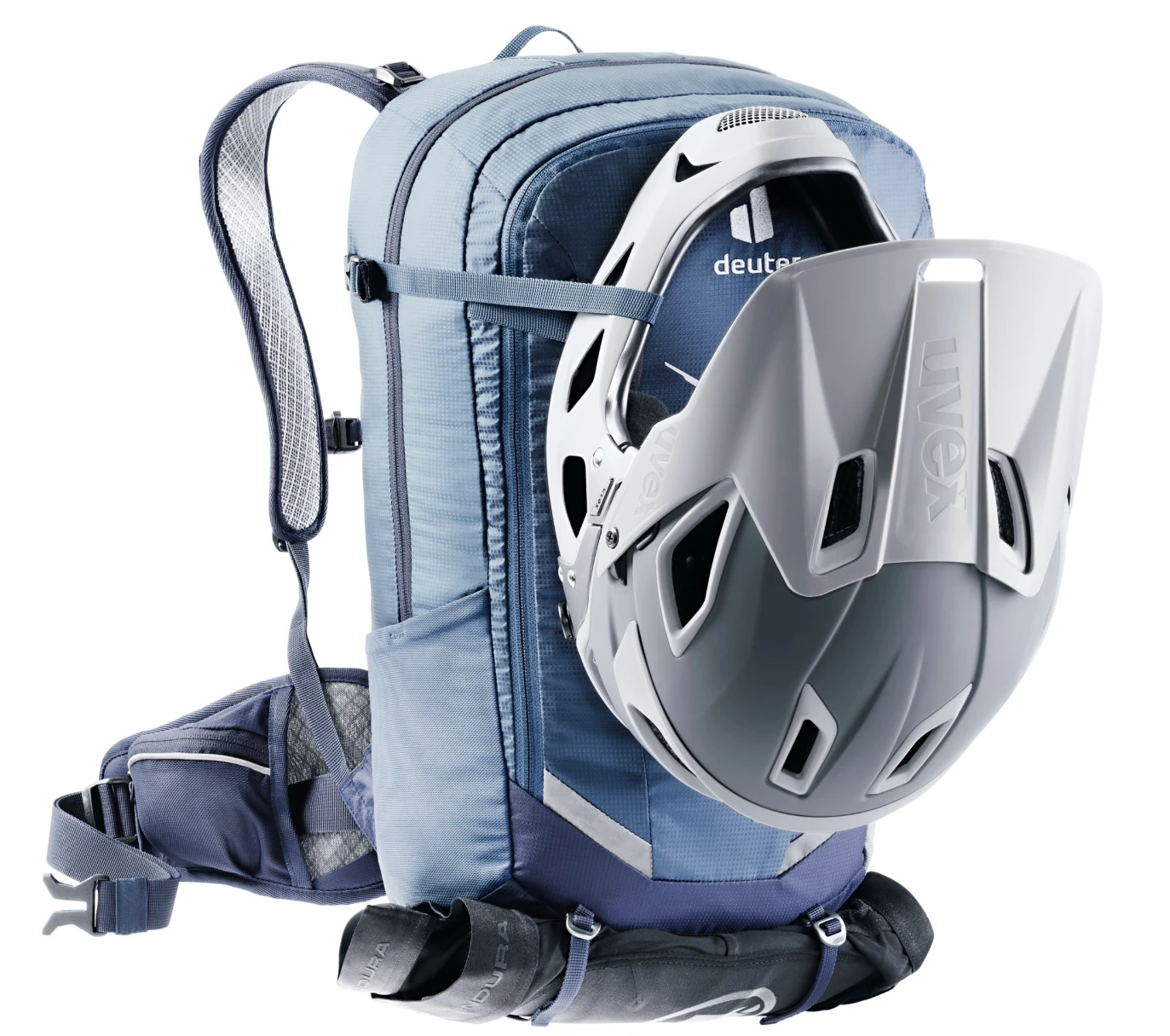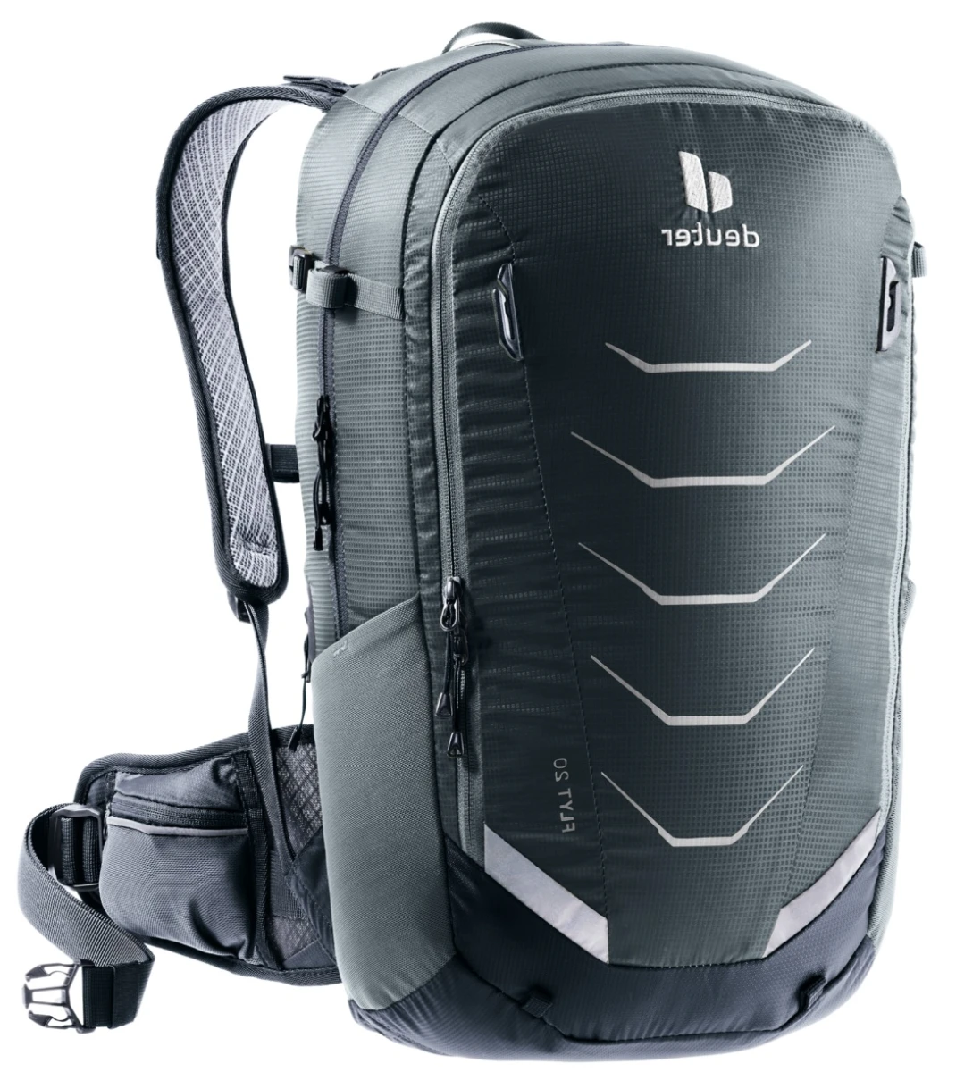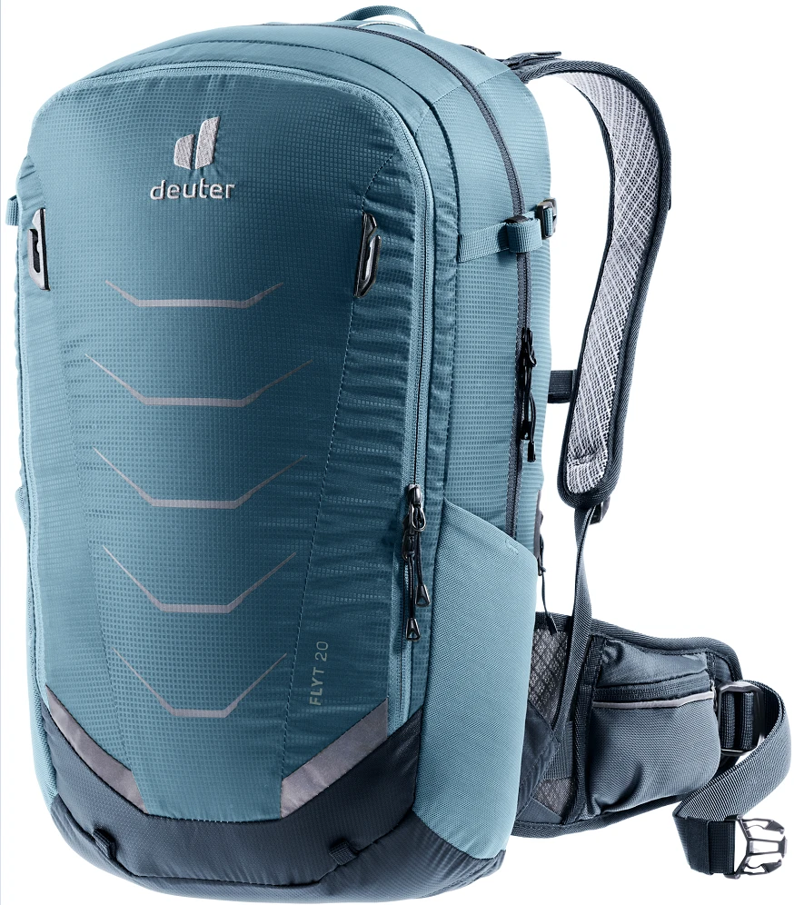 Deuter Flyt 20: Univerzální cyklistický batoh do náročného terénu od německé firmy Deuter. Hodí se hlavně na sjíždění trailů a pro náročnější ježdění enduro. Je vyrobený z pevného a odolného materiálu, a díky tomu odolá i horšímu zacházení a pádům. Zádový systém Airstripes výborně odvětrává a má ergonomicky tvarované popruhy, potažené síťovinou.