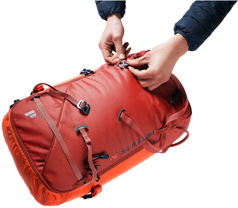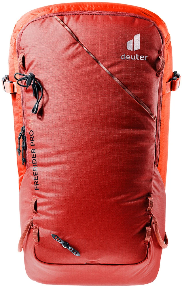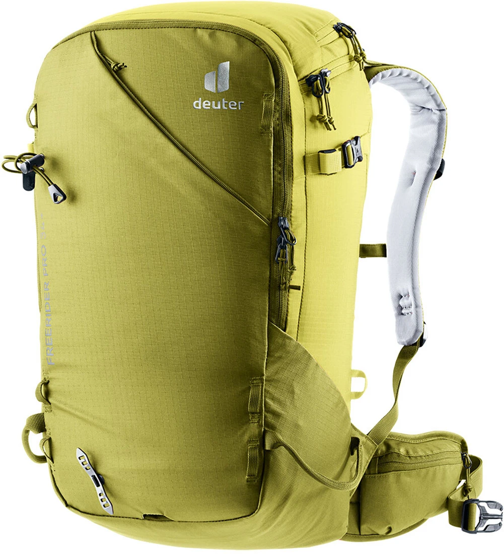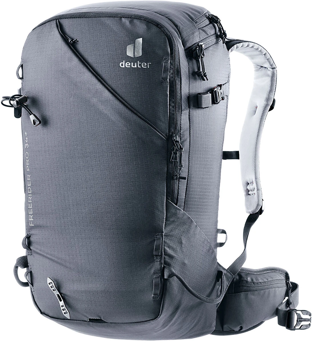 Deuter Freerider Pro 34+: batoh o objemu 34 litrů a pokud by nestačilo dá se zvětšit o dalších 10 litrů. Batoh je určený na freeride, nebo skialpinistické výpravy. Je vyrobený ze speciální tkaniny Ripstop, která je odolná proti sněhu, prodyšná a velmi pohodlná na nošení. Polstrovaná záda kolem páteře, v oblasti lopatek a beder jsou podpořena U výztuhou. Rozepínání od zad umožní dostat se do batohu aniž by jste museli sundat připnuté lyže či snowboard.