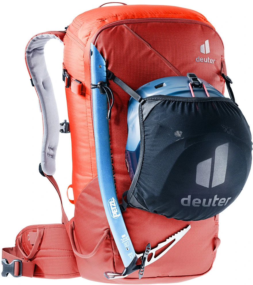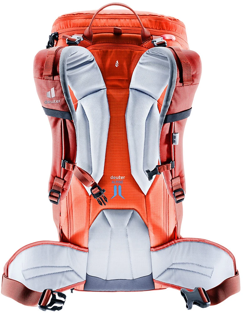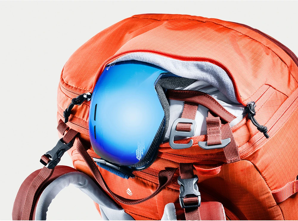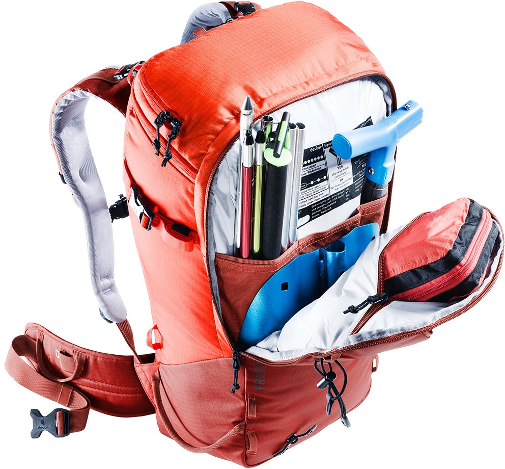 Deuter Freerider Pro 34+: batoh o objemu 34 litrů a pokud by nestačilo dá se zvětšit o dalších 10 litrů. Batoh je určený na freeride, nebo skialpinistické výpravy. Je vyrobený ze speciální tkaniny Ripstop, která je odolná proti sněhu, prodyšná a velmi pohodlná na nošení. Polstrovaná záda kolem páteře, v oblasti lopatek a beder jsou podpořena U výztuhou. Rozepínání od zad umožní dostat se do batohu aniž by jste museli sundat připnuté lyže či snowboard.