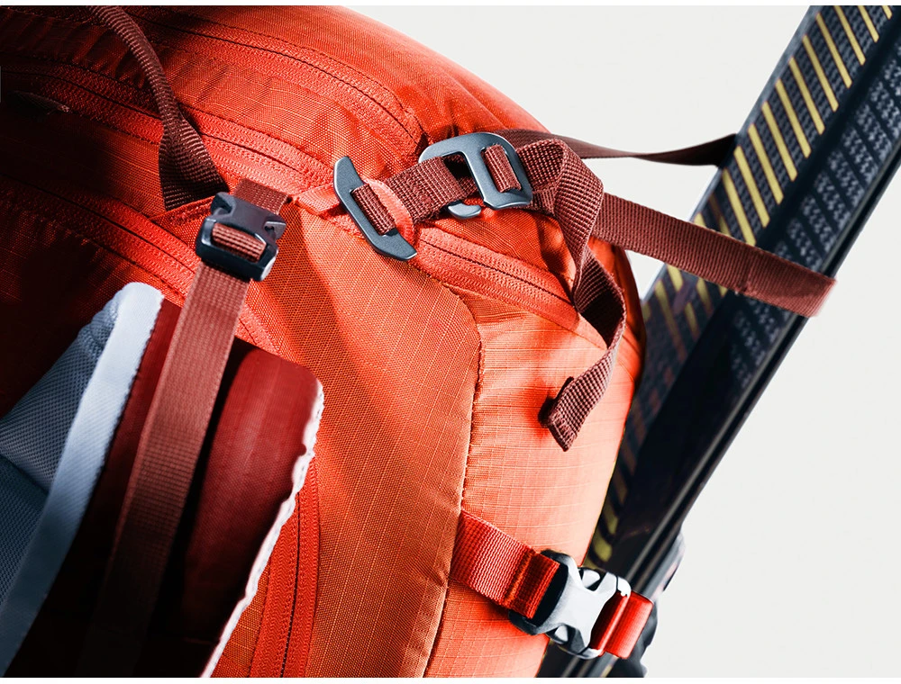 Batoh má kapsu na lavinovou výbavu, upevnění na lyže, hole, cepín, lano, další držáky pro snowboard a sněžnice které se dají schovat aby nepřekážely.