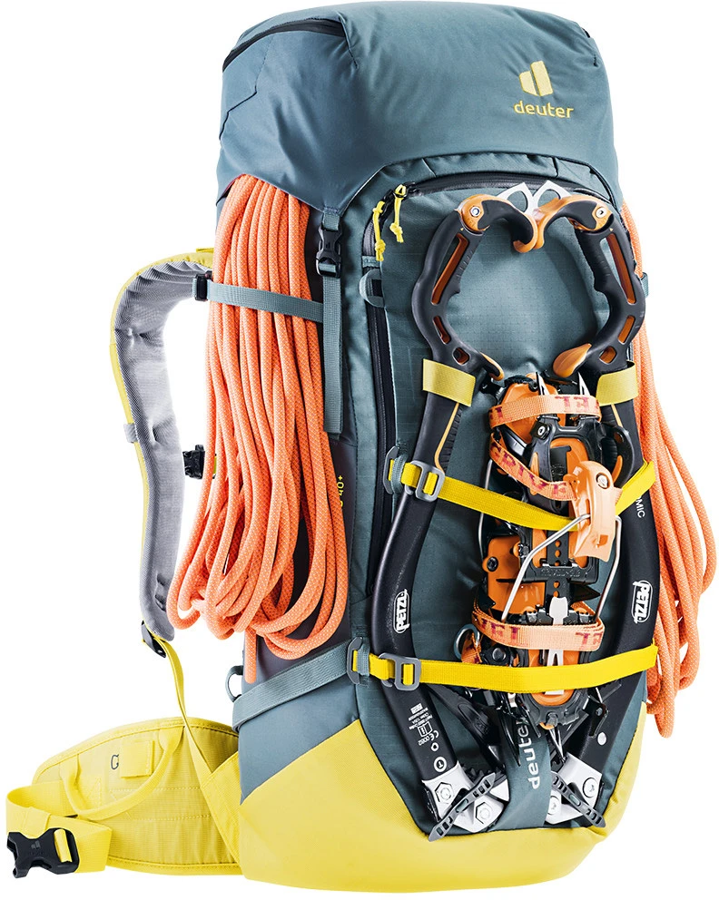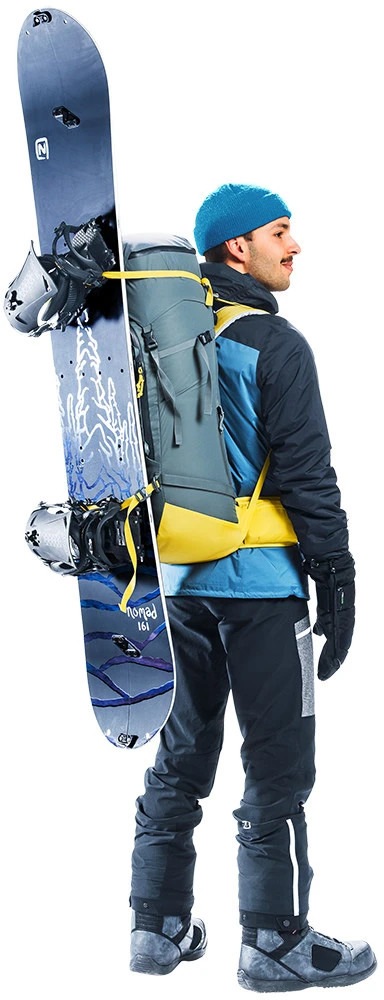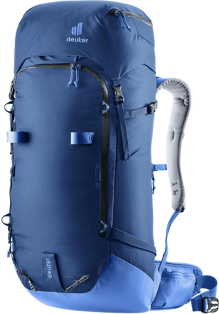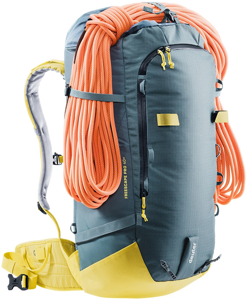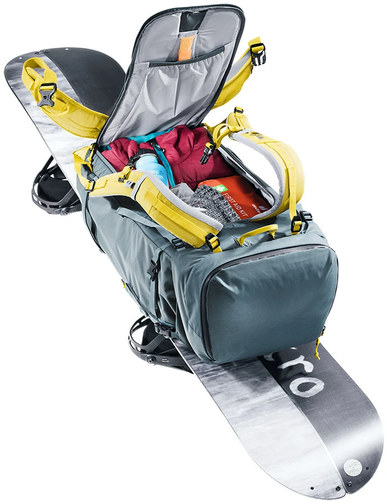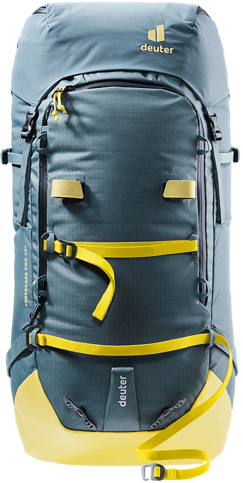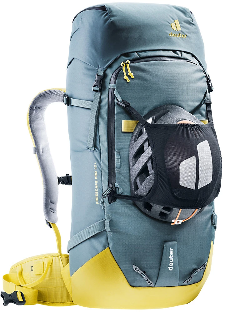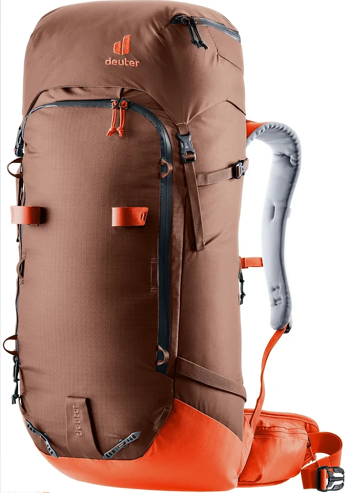 Deuter Freescape Pro 40+:skialpinistický batoh o objemu 40 litrů, pokud by nestačilo, dá se sundat víko a objem ještě zvětšit. Záda i ramenní popruhy jsou polstrované. Záda jsou ještě vyztužena Účkem z Delrinu a mají upravenou tkaninu, na kterou se nelepí sníh. Boční vstup umožní přístup do batohu aniž by jste museli sundat připnuté lyže či snowboard.